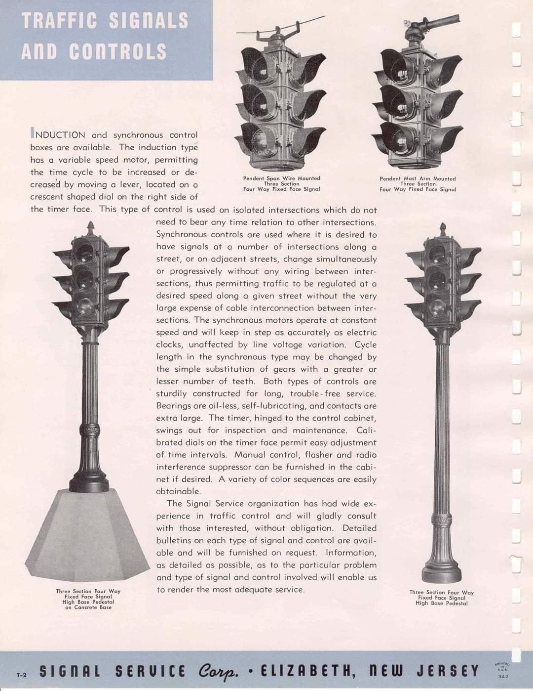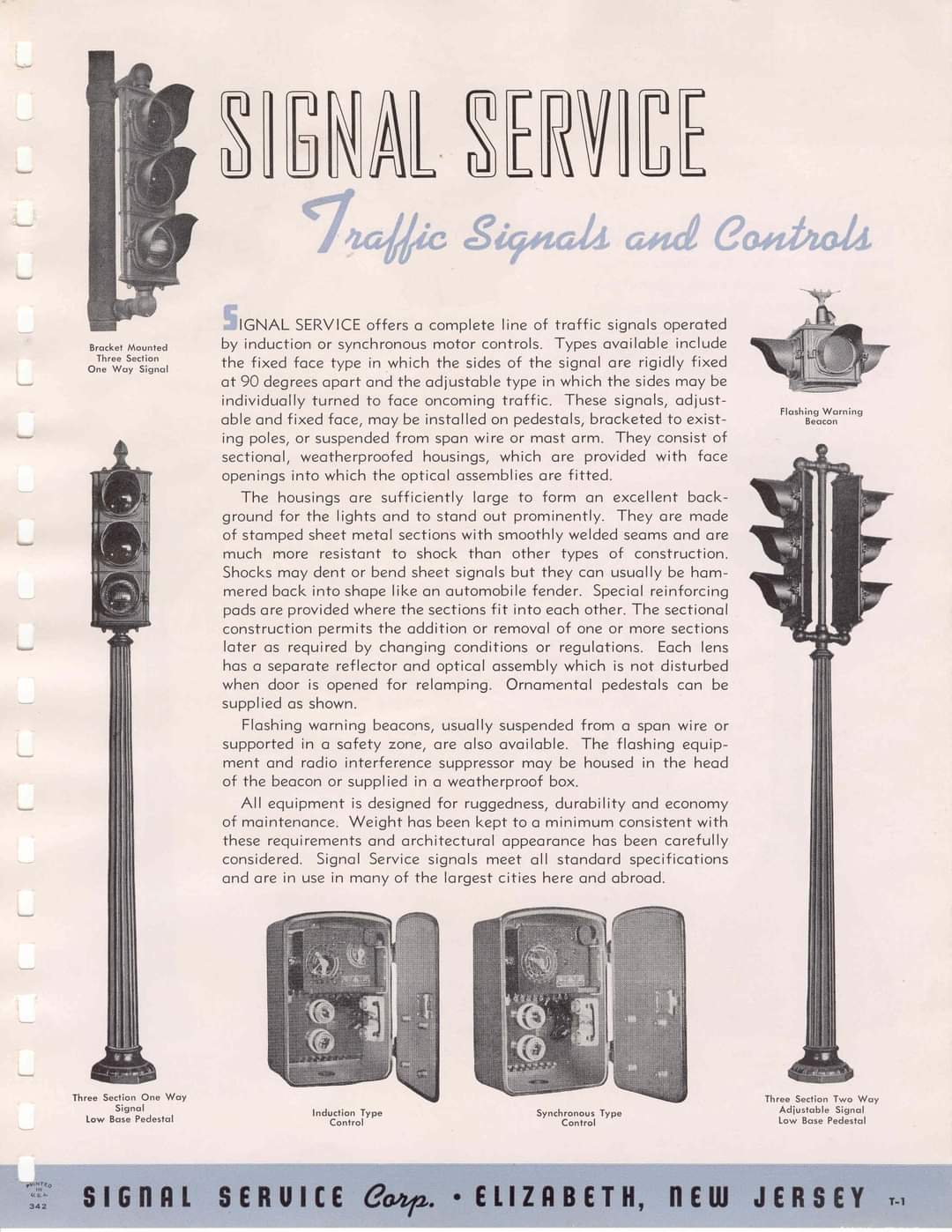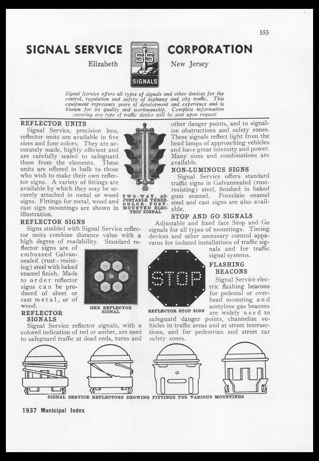 Signal Service Corporation (SSC), also of Elizabeth, took over production of AGA signals in 1932. According to page 1120 of this FTC antitrust complaint, SSC ceased producing traffic signals in 1941. I assume SSC did not, for whatever reason, re-tool for alternative materials during World War II, like some other manufacturers did. In 1945, Marbelite took over SSC’s Traffic Signal & Controller Division, which was still in existence, and they reincarnated the SSC-style signal for about a year or two.