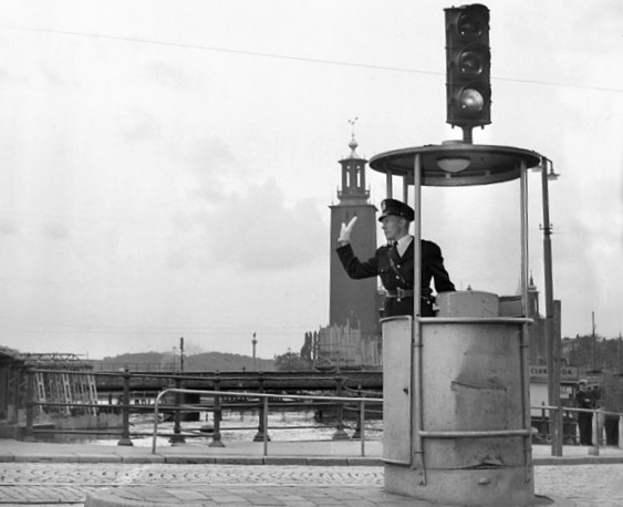 Right/above, another adjustable AGA signal in Stockholm, this one mounted atop a traffic officer’s booth. Photo taken from a Vintage News online article.