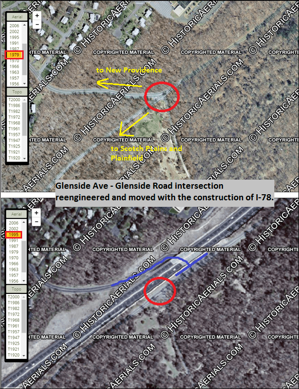 When I-78 was completed through Berkeley Heights in the 1980s (see bottom image), the Glenside Ave/Road intersection was moved and rebuilt as a T-intersection (purple lines). The sign would have been removed for this project if it was still even there.