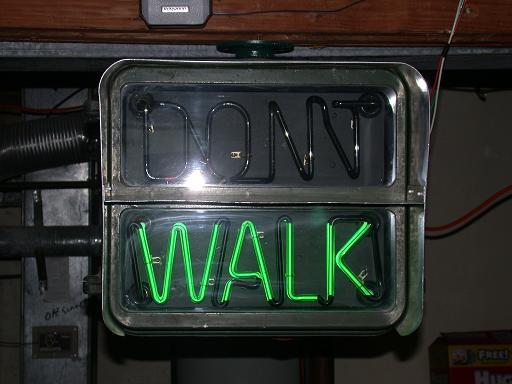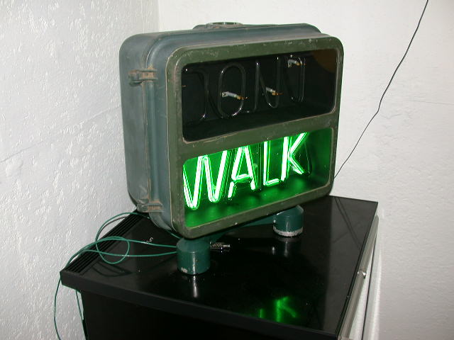 Functionally similar to the Marbelite LPS-20 Lawdescent Lite, this signal is obviously implemented differently in that it is illuminated by exposed neon tubes, as seen in so many business signs. These nifty 1950s Econolite peds were very popular on the West Coast. I don’t have this signal any longer – I really wish I’d kept it.