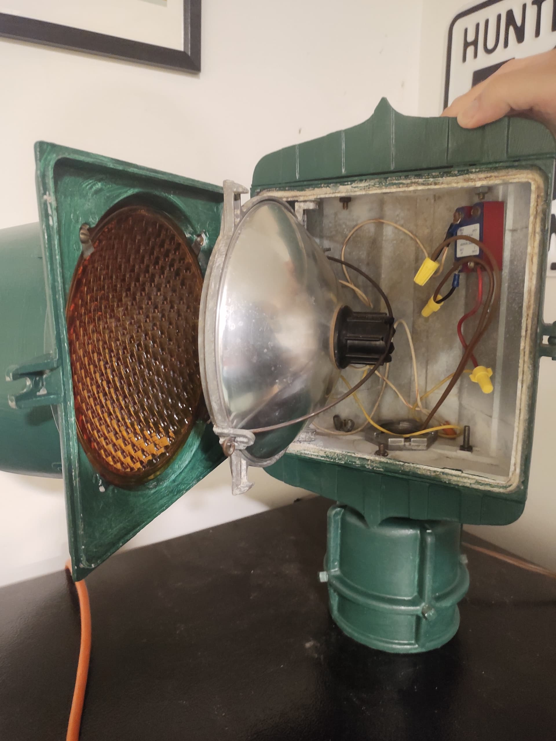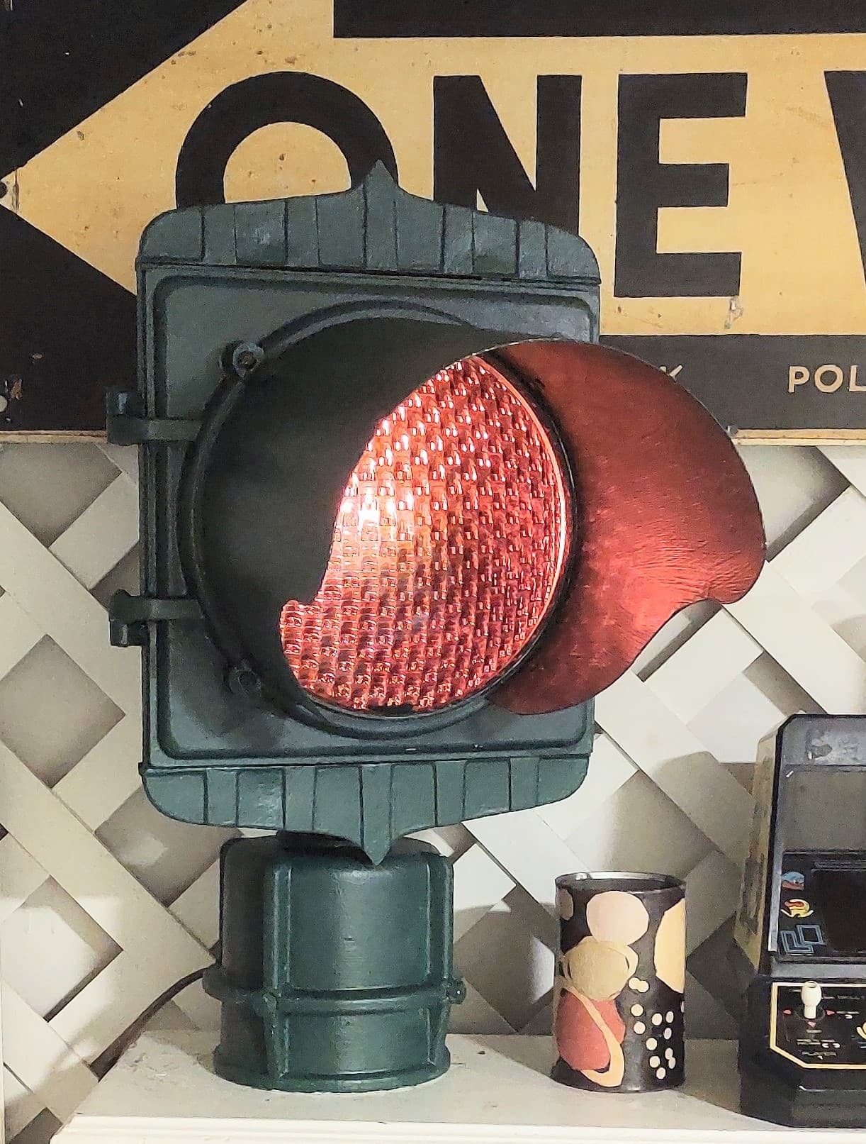 In March 2024, I picked up an early ’50s Marbelite with a full set of Houzex-Marbelite No. 6540 lenses. The signal was damaged, but the lenses thankfully were all unbroken. I parted the light out and kept the undamaged amber segment to display as a single-face beacon. The red lens completed the set in my Hoboken Marbelite.