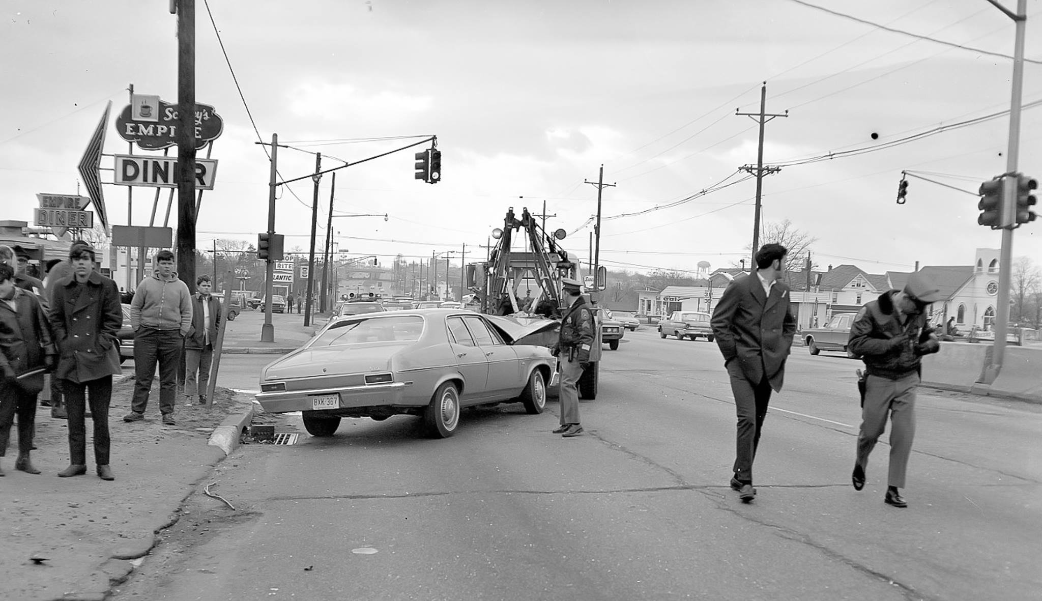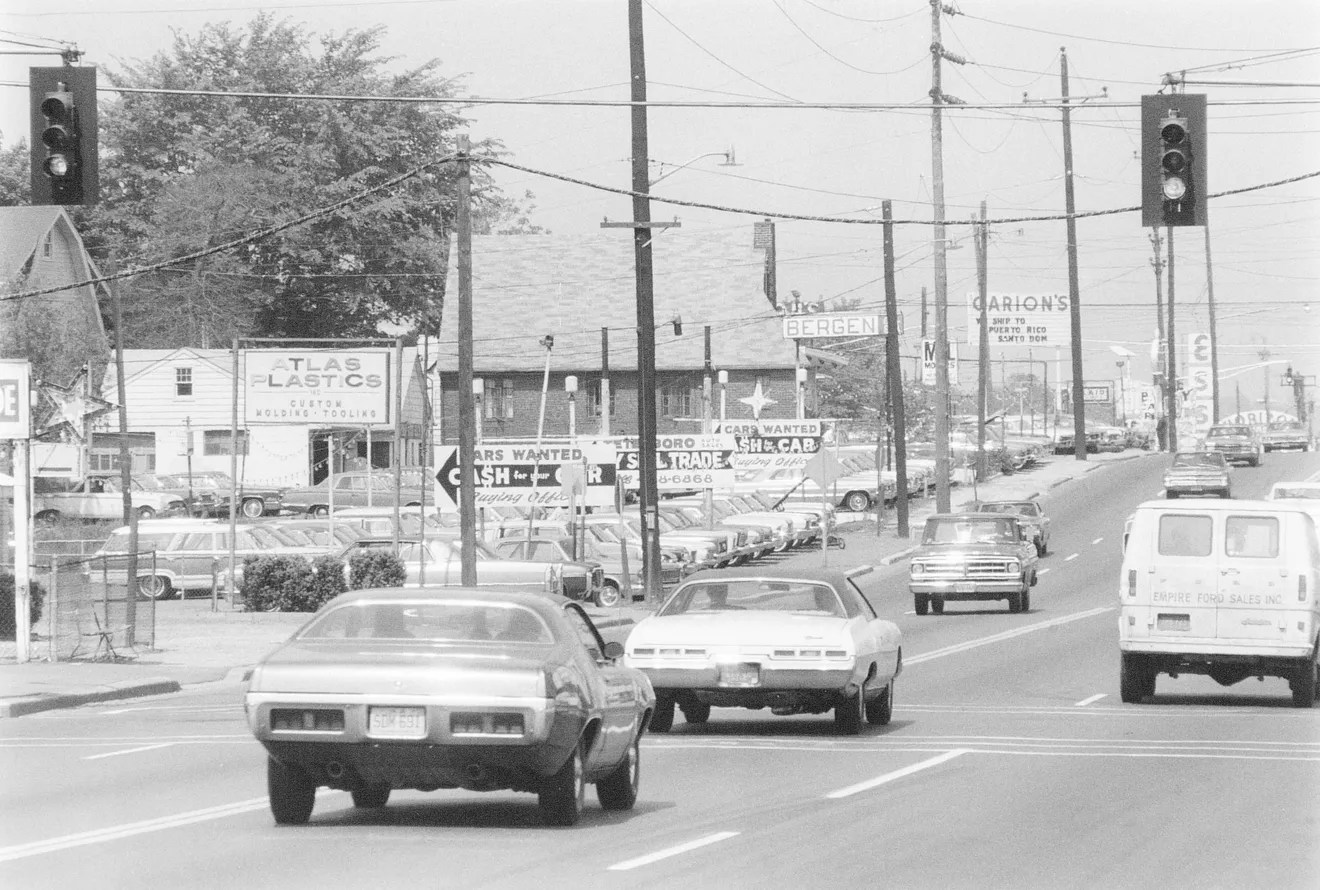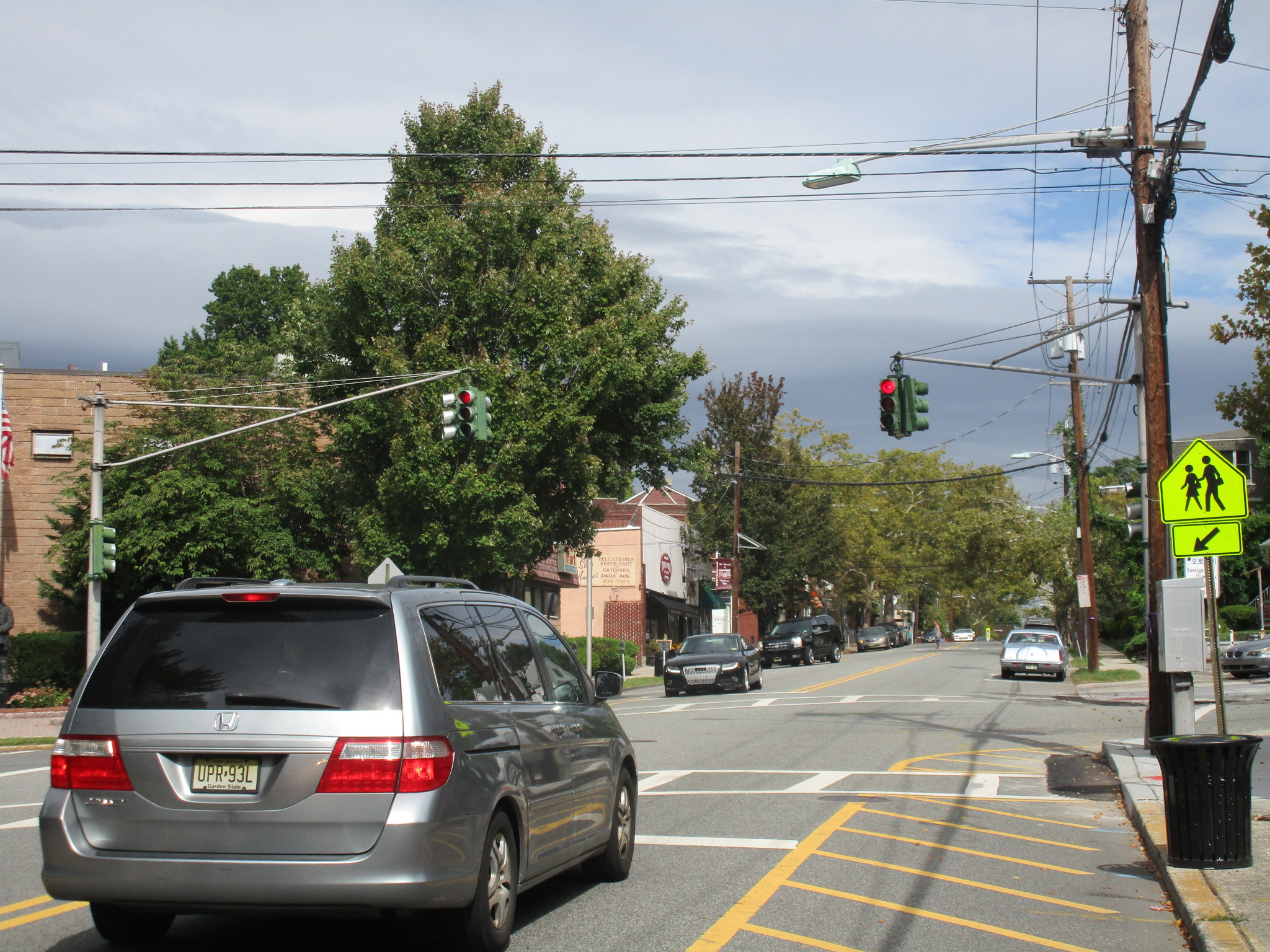 Circa-1950 Marbelite signals with back plates were still keeping traffic flowing along US Route 46 in Lodi in 1971.