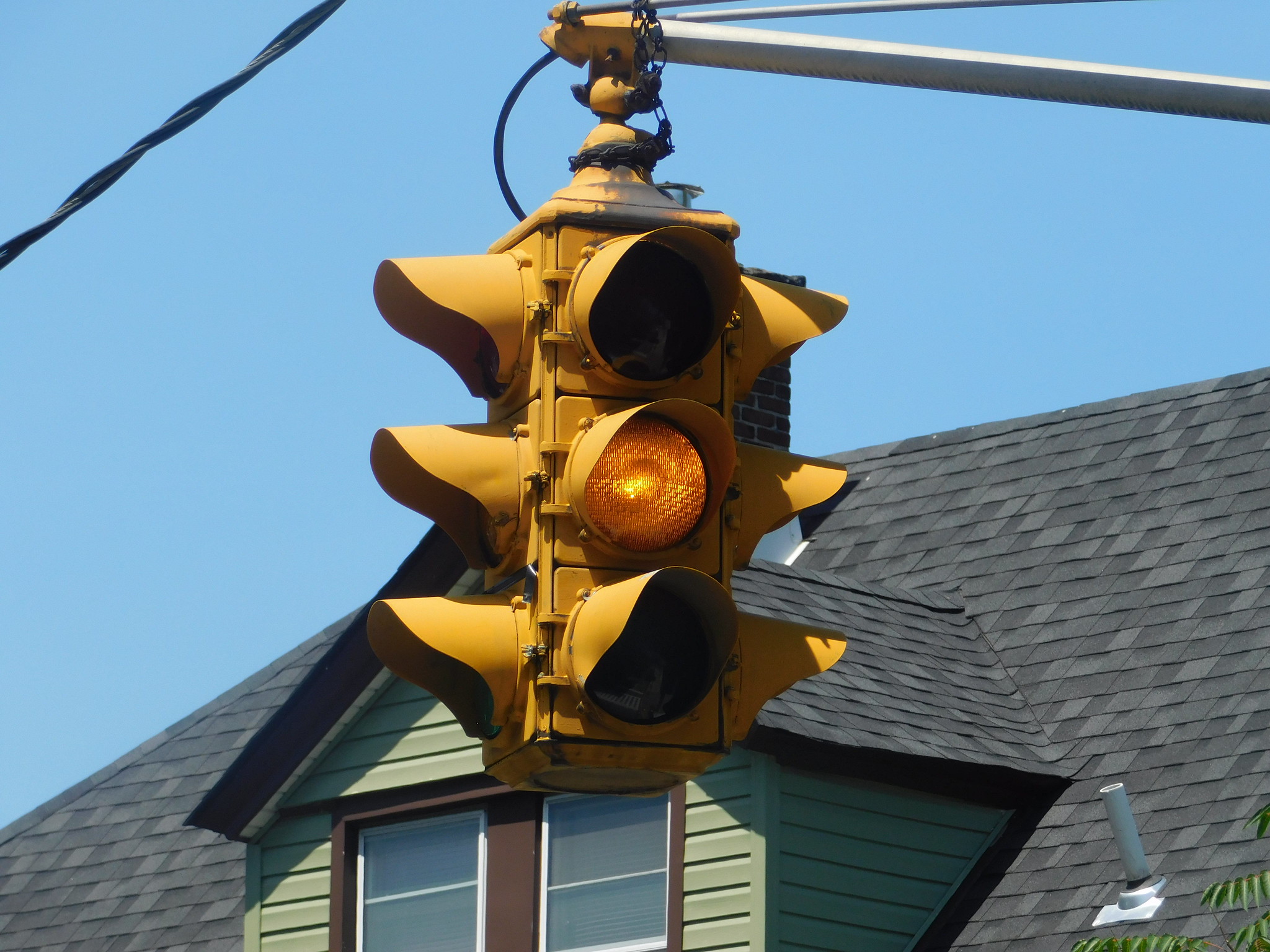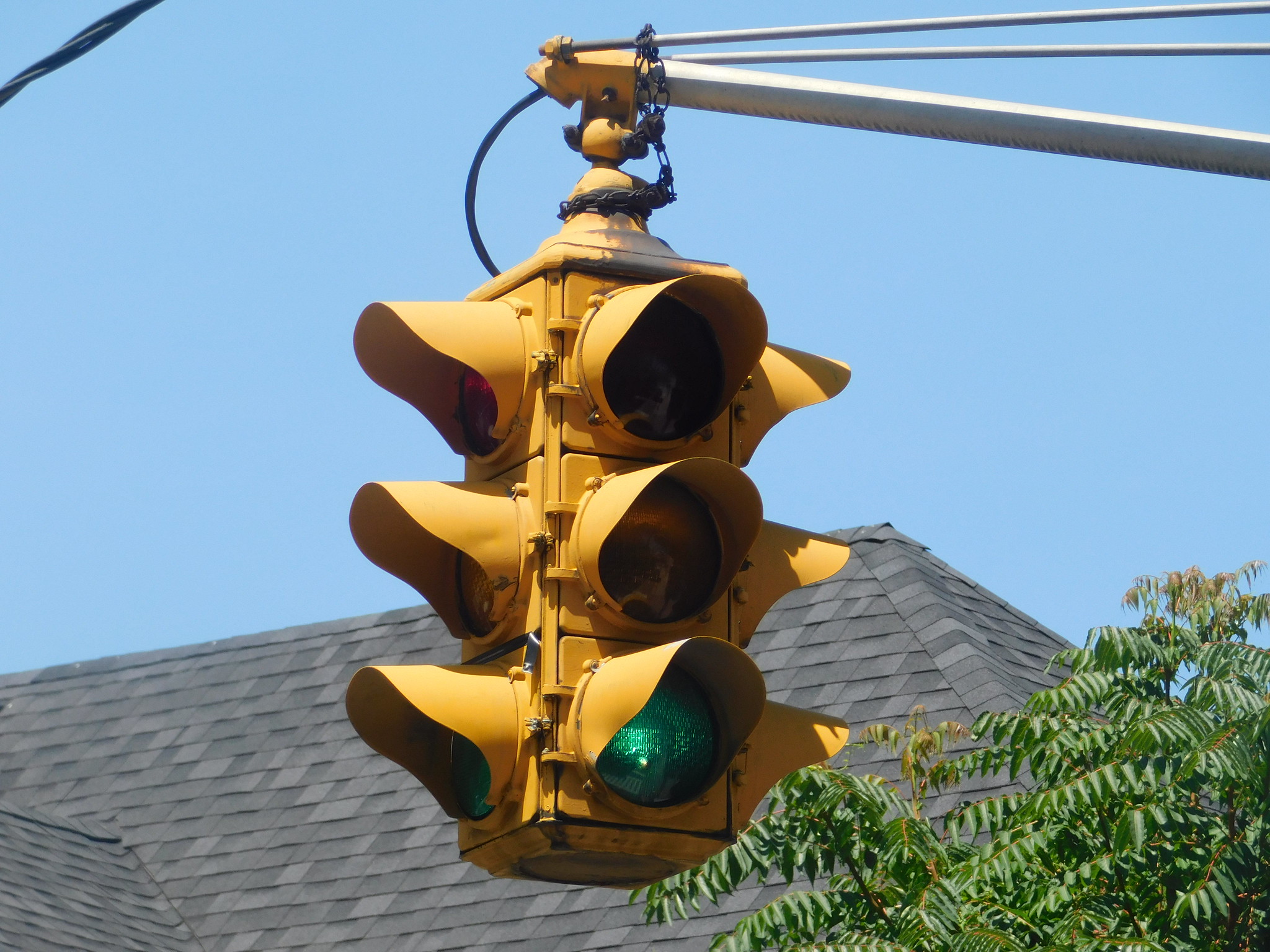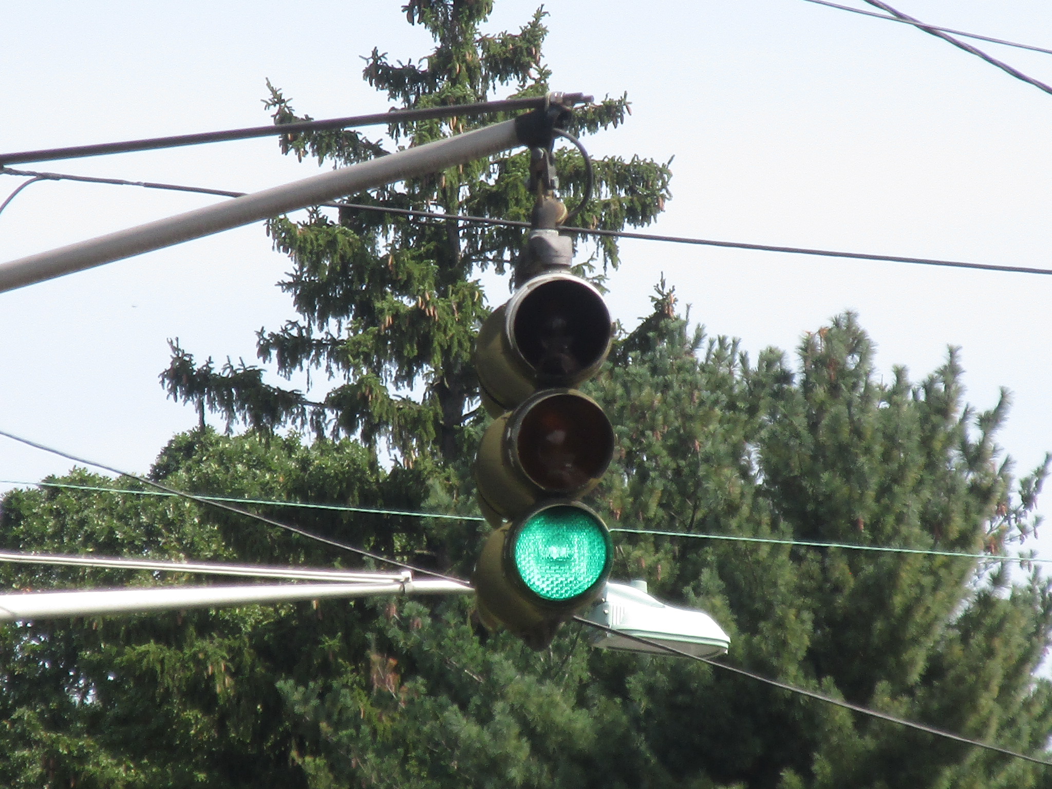 On the right, fast-forward 70 years to an image from Google. The pole with the “milk jug” base is pretty old; probably dating from the 1960s. The signals are much newer, but still only 8″, which is becoming a rarity these days.