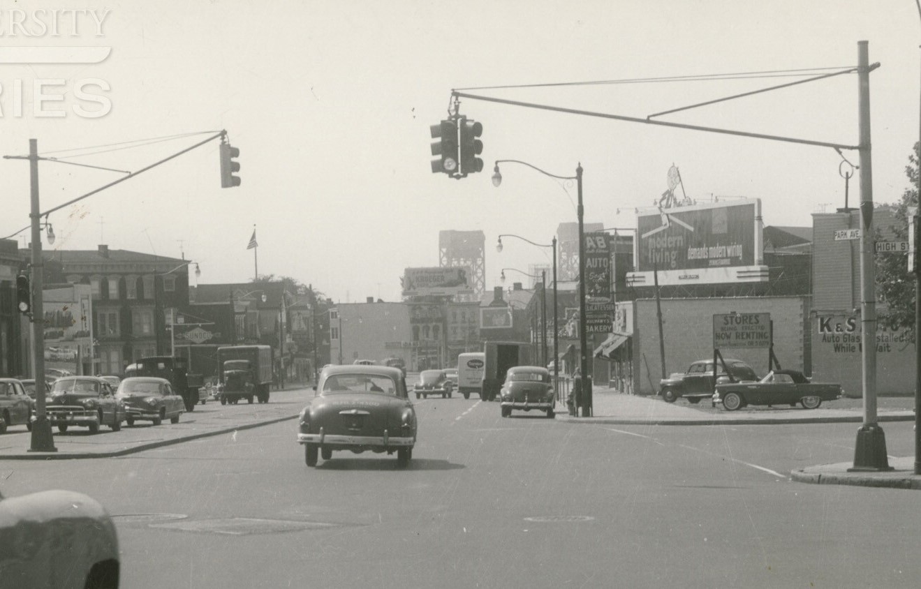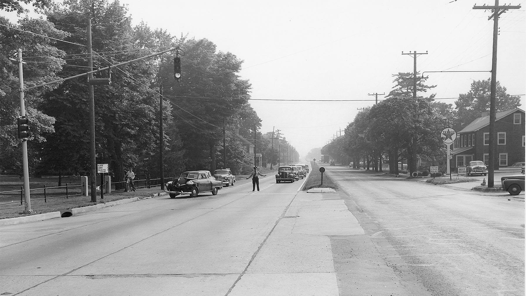 On the left, a shiny new Marbelite 4-way cluster draws a crowd at the corner of West 7th Street and Clinton Avenue in Plainfield in 1948. I assume the officer was switching the signal on – or switching from flash mode to full operation – for the first time. This early aluminum post with the small flange at the base predates the box-based posts.