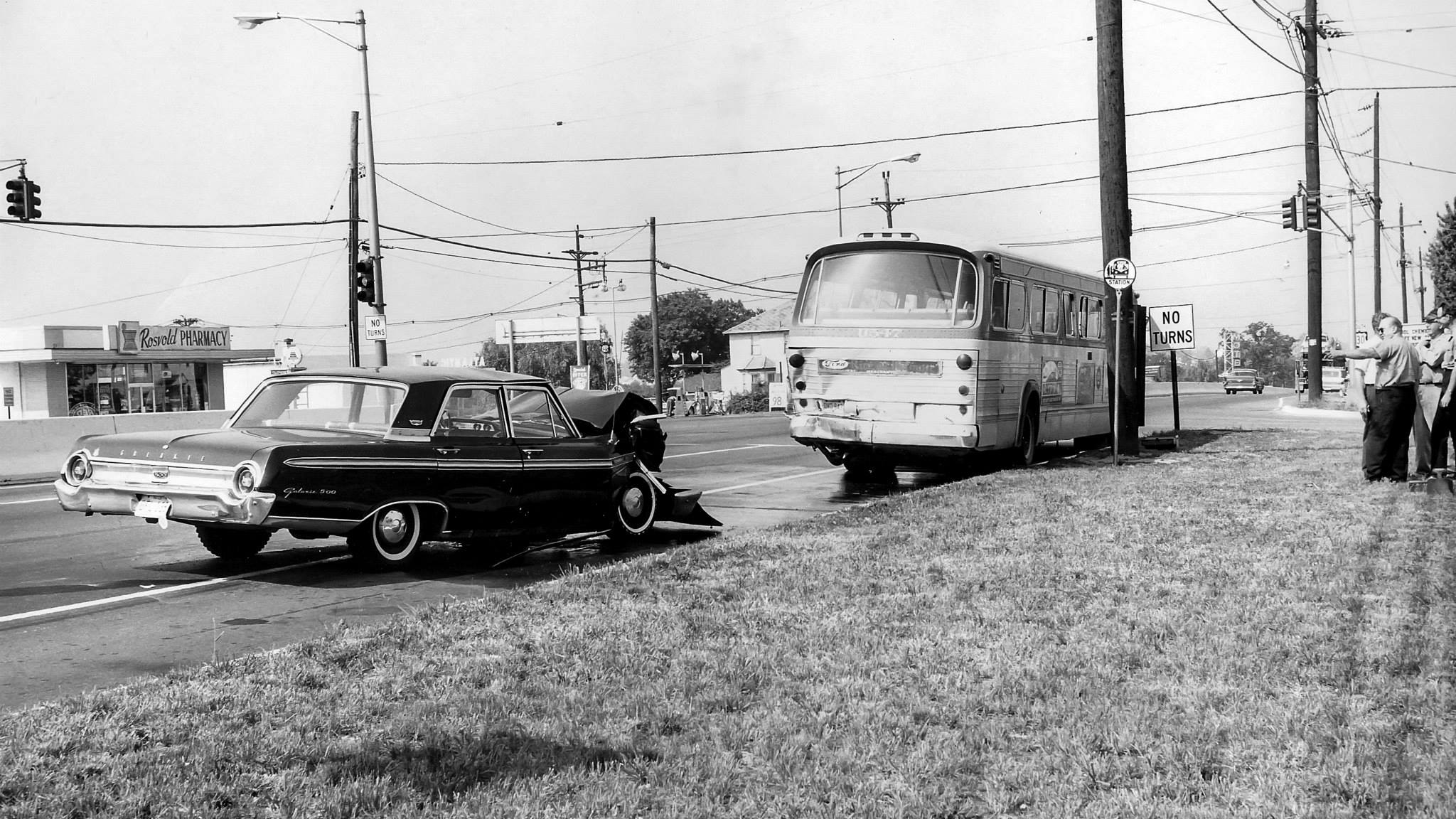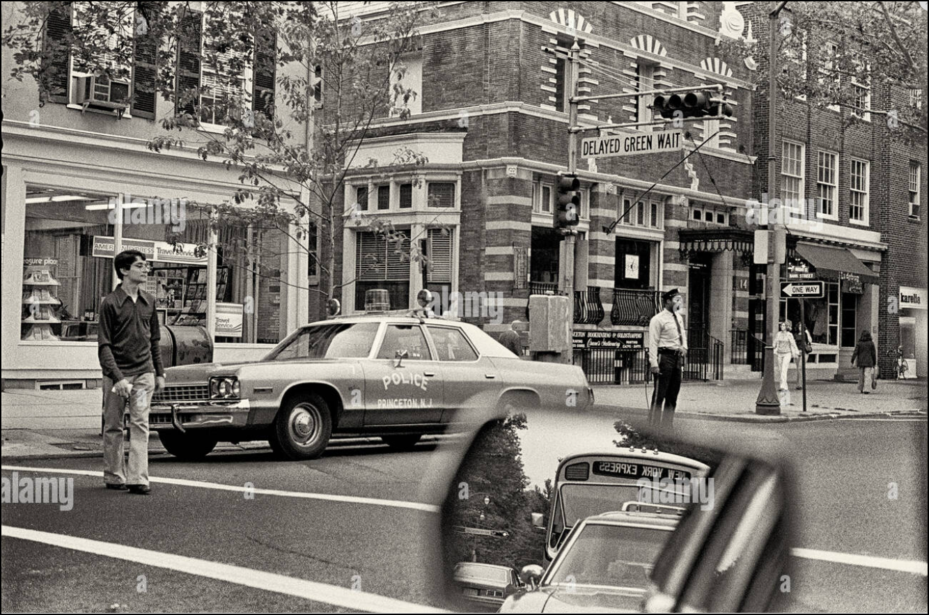A really nice view of Nassau Street in Princeton in 1969. Looks pretty much the same today, except for the signals. These look like 1950s Marbelites. Note the bus and signal reflected in the rear-view mirror.