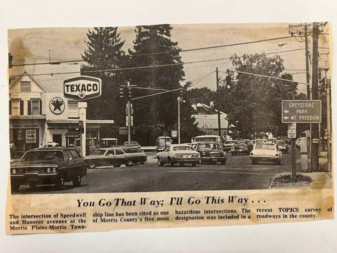 A circa-1970 newspaper clipping shows guy-wired masts with back-to-back Marbelite signals commanding the increasingly dangerous intersection of US-202 and Hanover Ave in Morris Plains. I wonder how long it was before these older lights were upgraded to signals with protected left turns.
