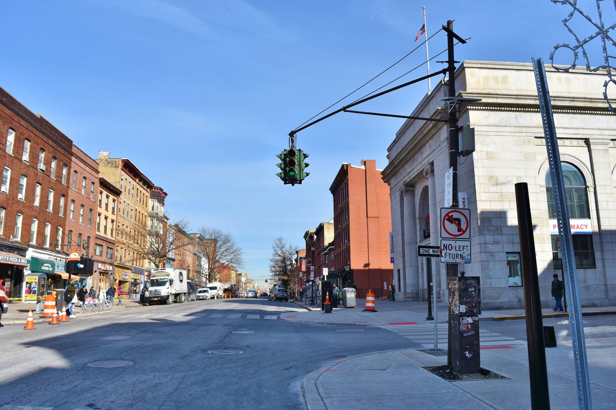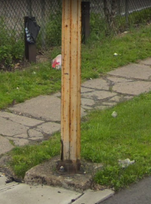 The oldest signal remaining in Paterson is this pair of GE “Groove Backs” from the late 1930s or 1940s, at 20th Ave and E 31st Street. Another steel pole and mast is across the street, but with newer signals.