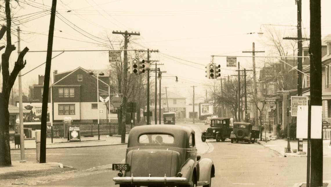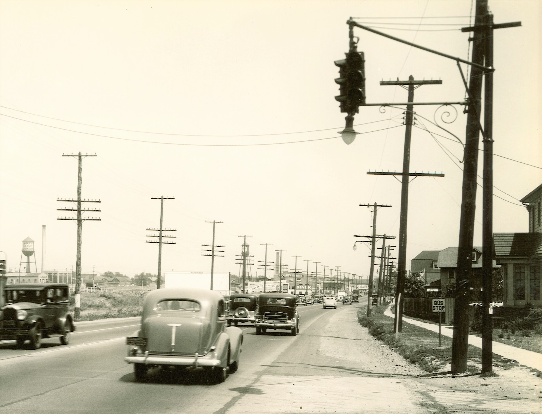 Traffic was already congested in the 1930s along US Routes 1 & 9. The two photos above, taken in Linden in 1936, show late ’20’s/early ’30s vintage solid-body Horni signals hung along the route.