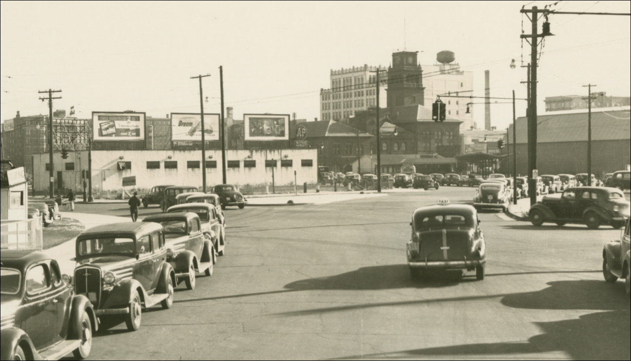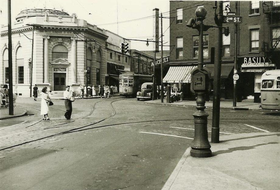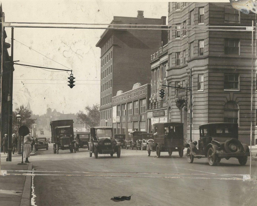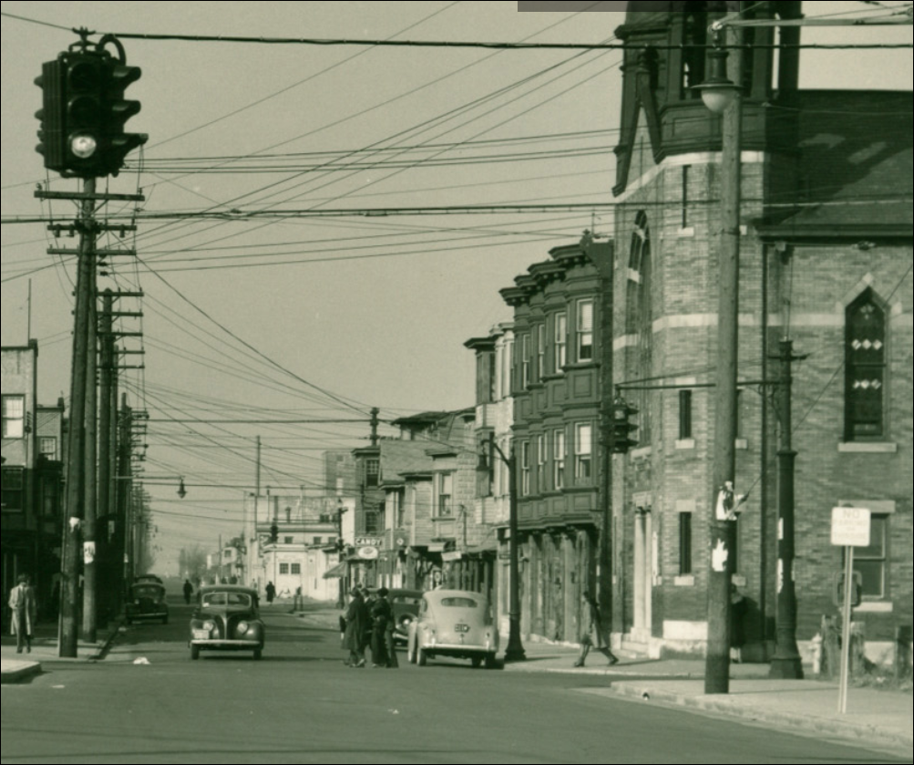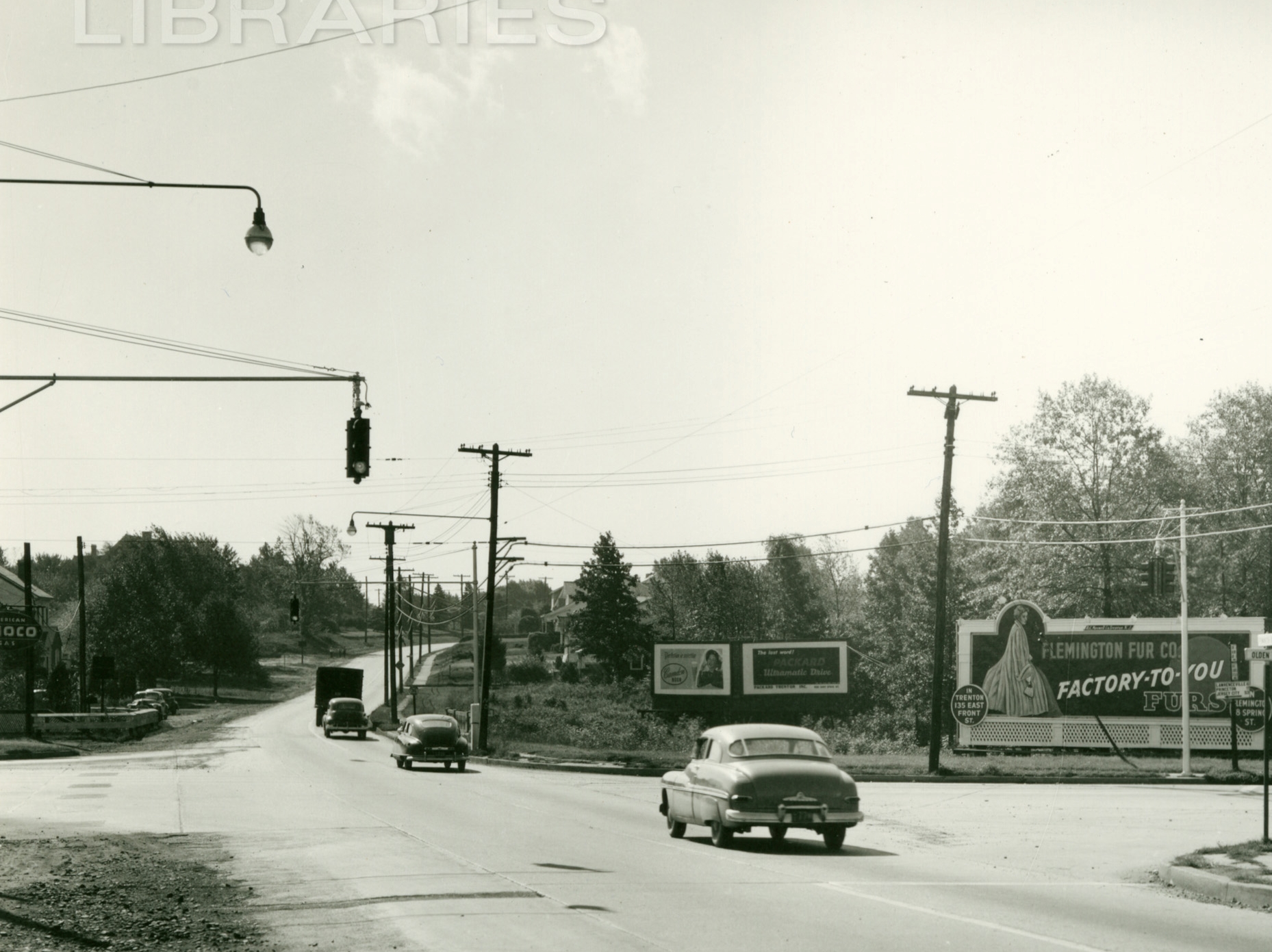 This 1949 image is of an intersection in Trenton that I wish I had more photos of. There are square louvered attachments on some of the signals to hide the indications from opposing lanes coming in a acute angles. An AGA cluster in the background looks like it has a louvered red indication facing the camera – notice the vertical striping when viewing the photo at full size. The signal cluster in the extreme upper left corner is made of sectional Horni signals. Note the decorative seashell covers on the pole base.