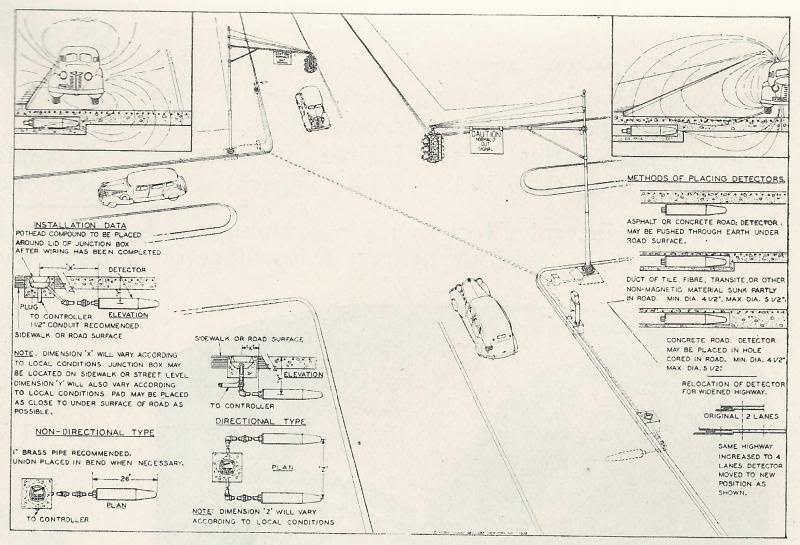 March 1939: An early installation of Horni sectional signal clusters at the corner of Pennington Road (old NJ Route 30) and Parkway Avenue on the Trenton-Ewing border. The illustration on the right, published by Horni Signal in the 1941 Municipal Index, appears to be the same intersection. My assumption, which may be wrong, is that the signs saying CAUTION NORMALLY OUT SIGNAL refers to the fact that these signals only operated at designated rush hour times, and were otherwise left dark or in flash mode (image courtesy of Mike Natale).