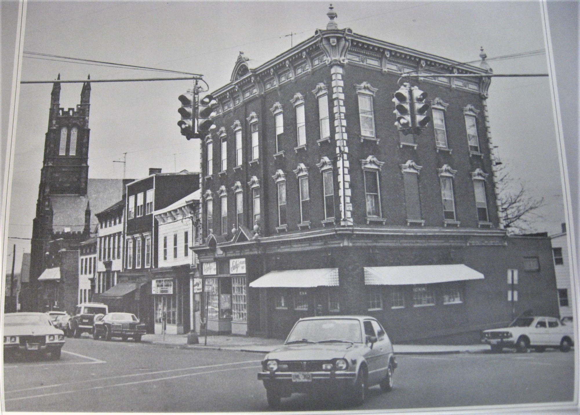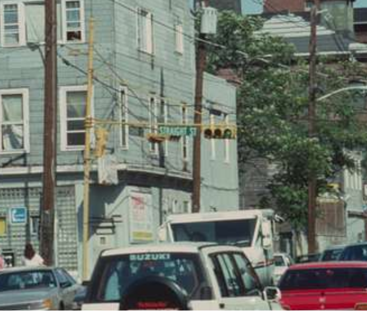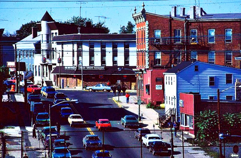 A back-to-back cluster of Eaglelux signals from the 1930s or ’40s hangs from a steel guy-wired mast in Hoboken in 1973. A block away hangs two Marbelite clusters from the ’50s or ’60s with 8″ green arrows. Way in the background are some horizontal signals. This photo represents pretty well the odd mixes of signals from different eras that could be found all over Jersey back then. It’s that sort of variety that I really wanted to capture on this website.