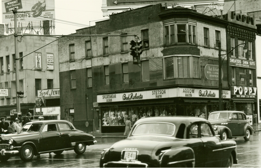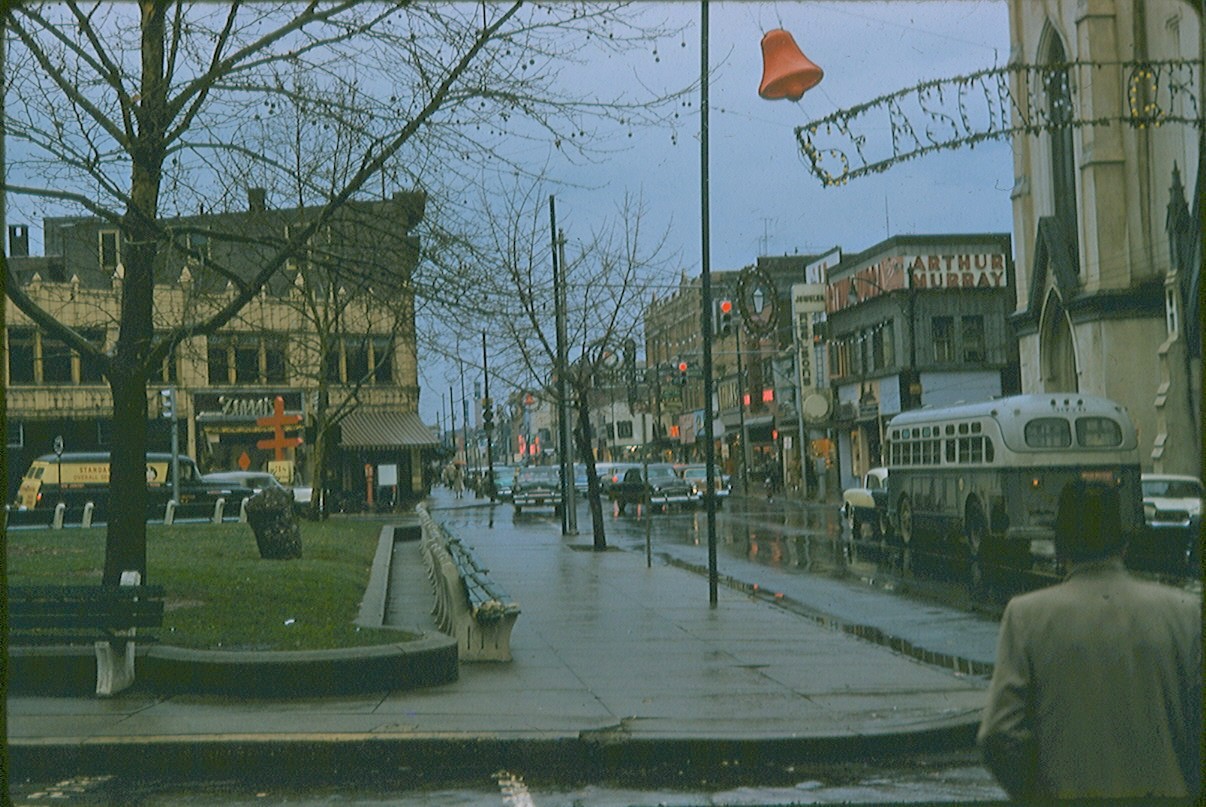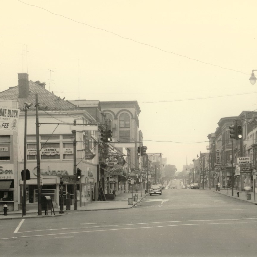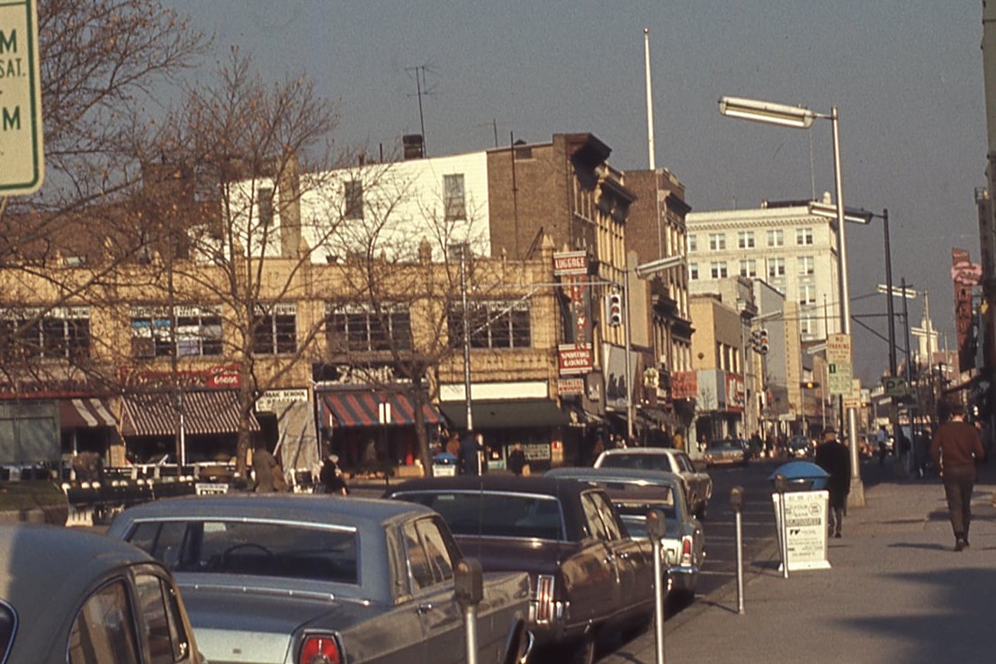Downtown Passaic in the 1950s. These masts could be from the late ’20s. They were replaced in the early ’70s. Best I can tell, these appear to be Crouse-Hinds type D signals, as the edges look clean (i.e., no latches/hinges) and the blank sides are simply flat faces.