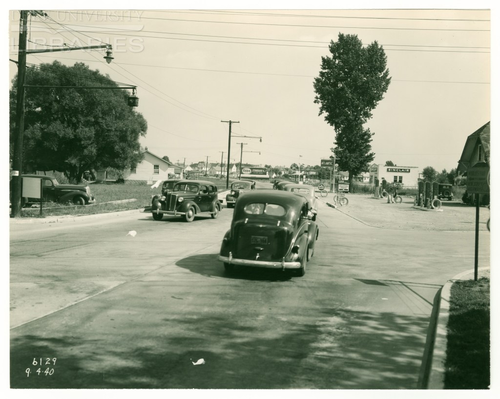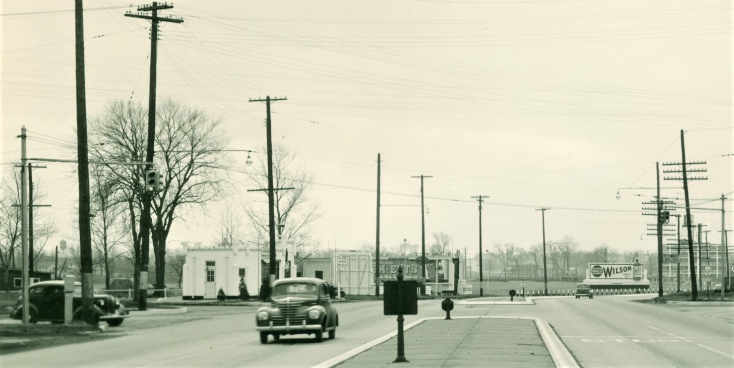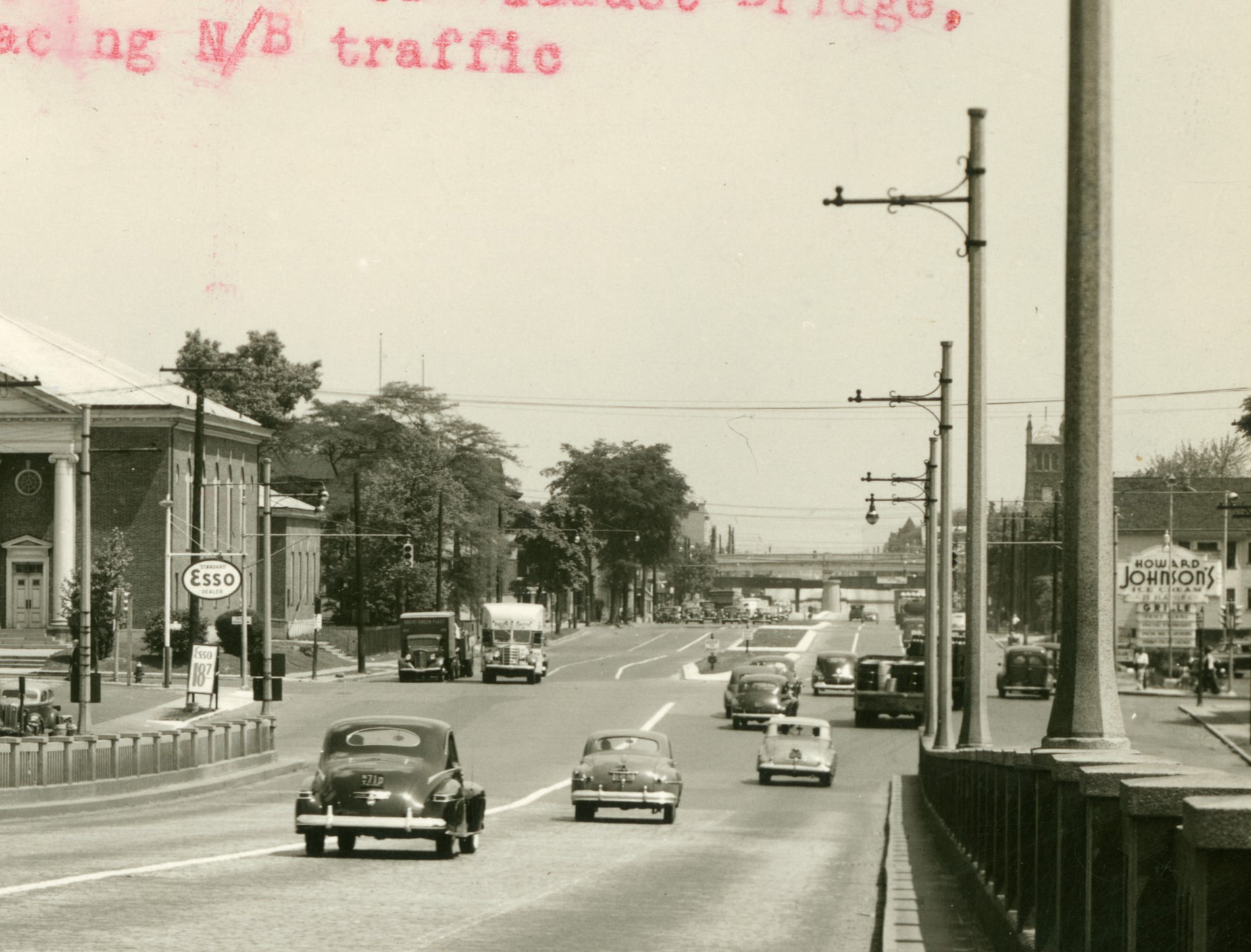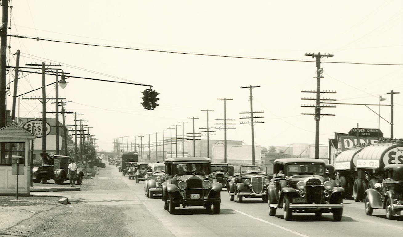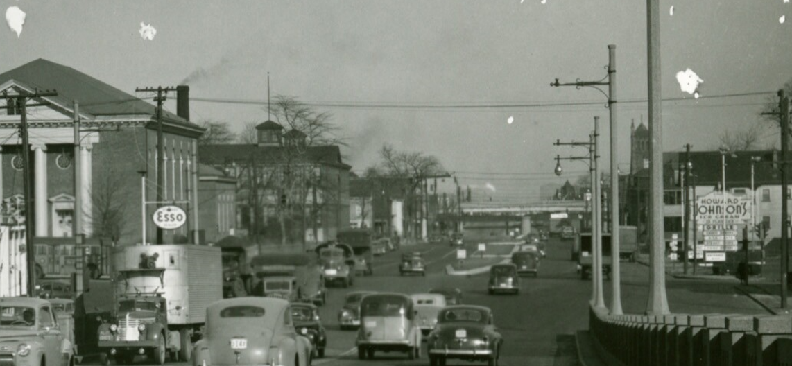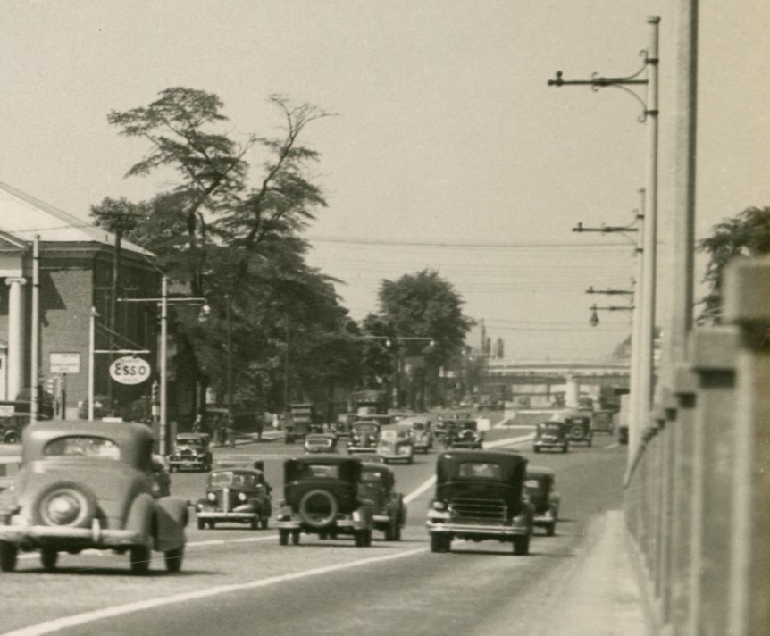 Above, we get a rare glimpse of the progression of signals at an Elizabeth intersection over several years. On the left, in 1938, pedestal-mounted, Elizabeth-manufactured AGA/SSC signals (look below the Esso sign) controlled the wide intersection at the base of the viaduct. In the center, by 1941, the highway had been upgraded to mast arms, while the cross-street still had the pedestals. While the mast arms were an improvement, it still looked pretty inadequate from a safety standpoint. On the right, by 1946, the signals had been repainted from silver to dark green.