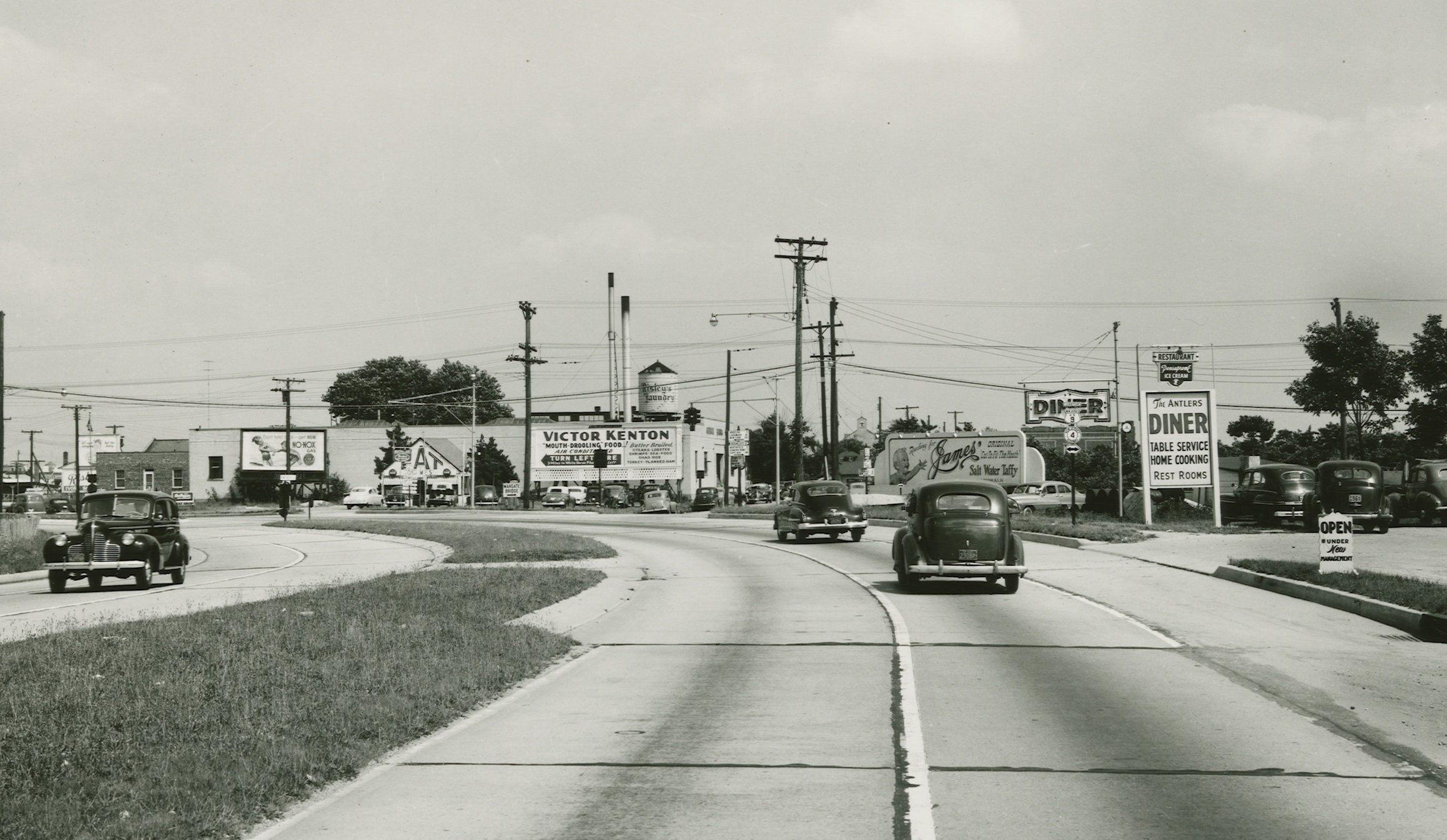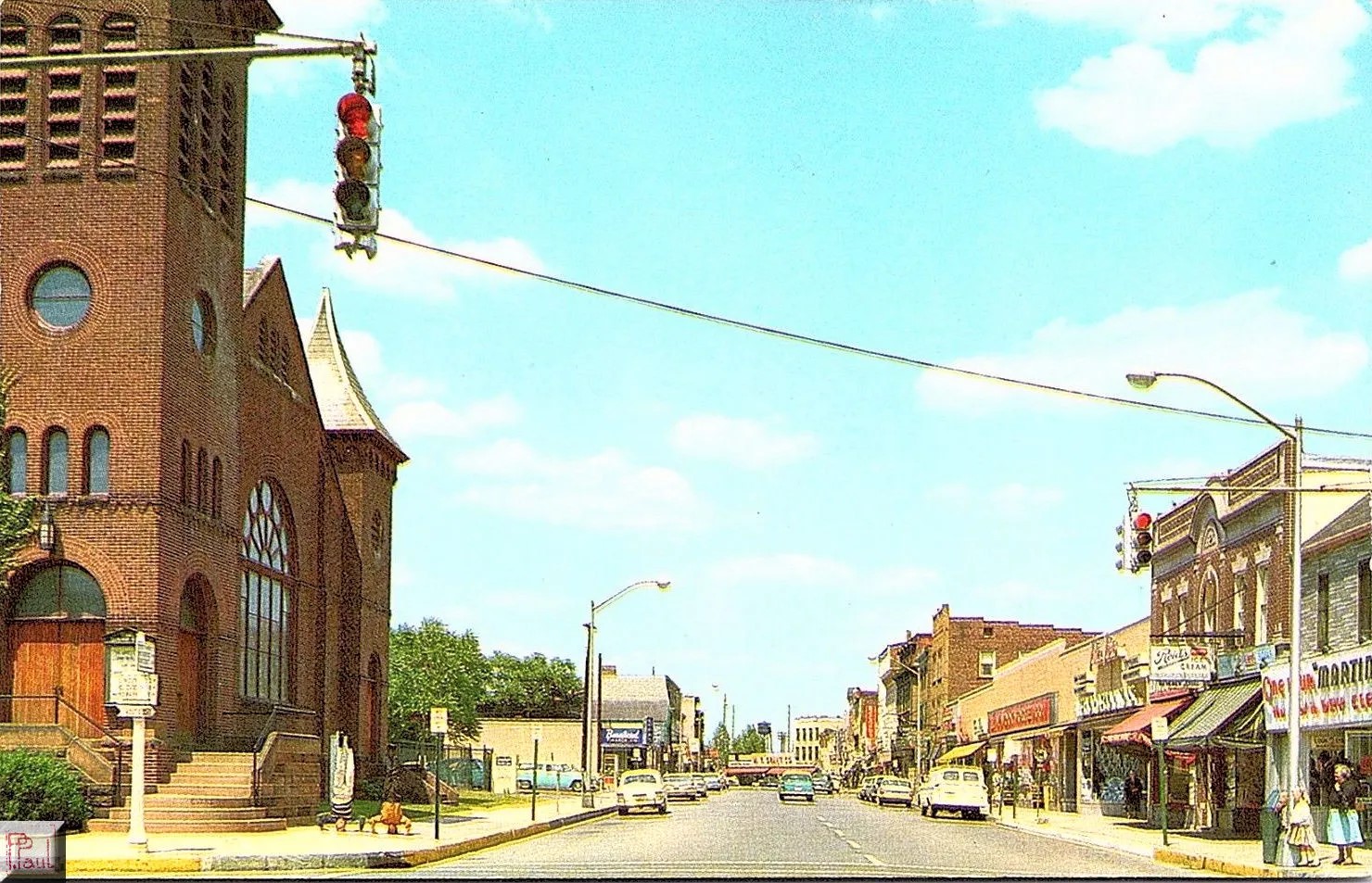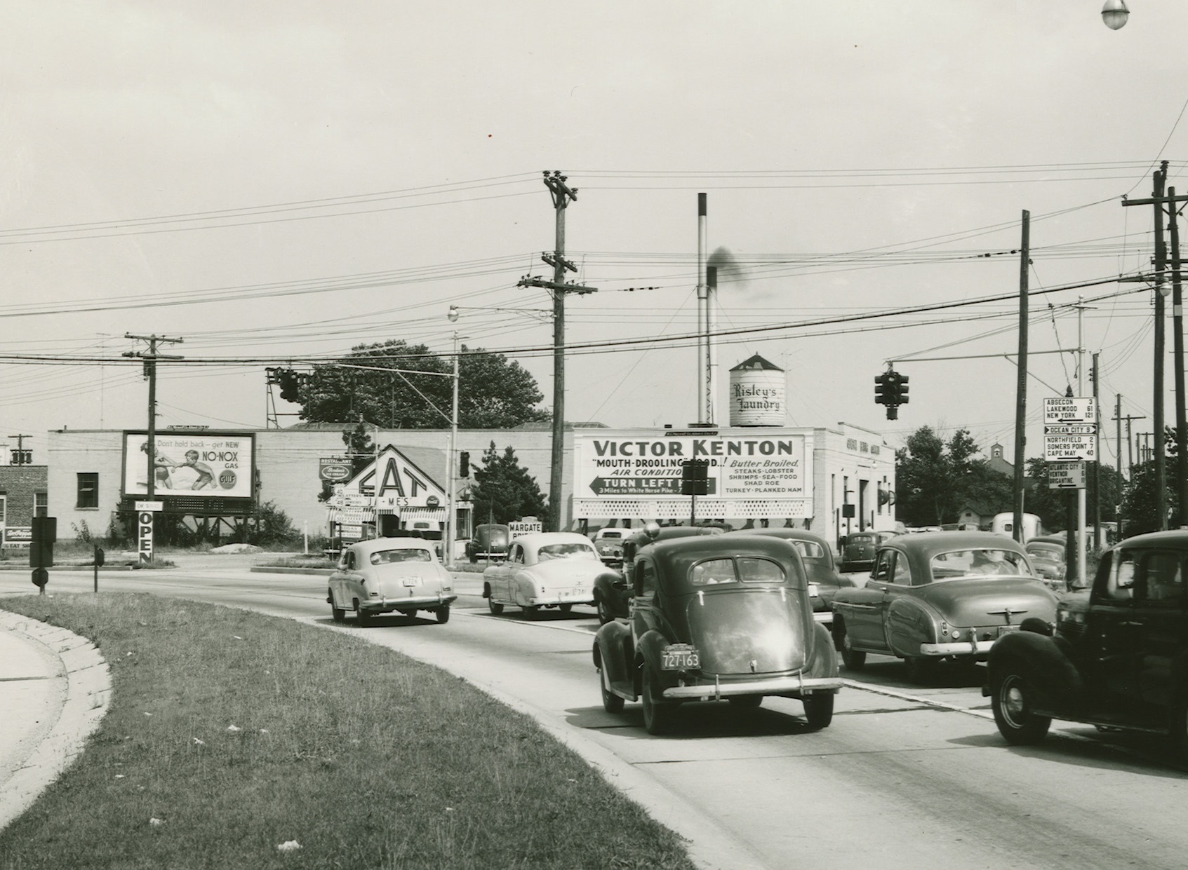Just across the marsh from Atlantic City is the city of Pleasantville, certainly one of the first places to experience the headache of Jersey Shore traffic on summer weekends. These images show sectional Horni signals in 1950, along with some lovely cast aluminum highway shields and cast iron guidepost signs. The pendant section hanging from the 4-way cluster on the right appears to be an older, rodded Horni section.