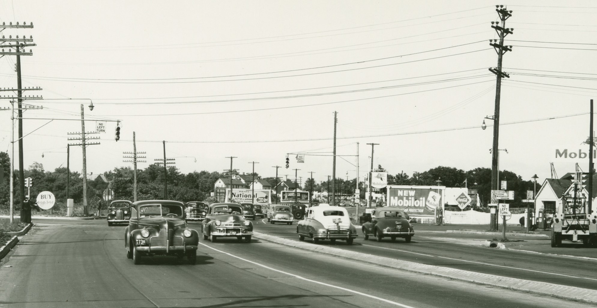 This wonderful, ca. 1940 photo of Weehawken and the nearby Manhattan skyline is interesting in many ways, not the least of which are the traffic lights. A Horni Type 491 island signal from the mid 1920s is still in the middle of the street, and by this time has been joined by a steel mast arm with a 4-way cluster of Horni modular signals.