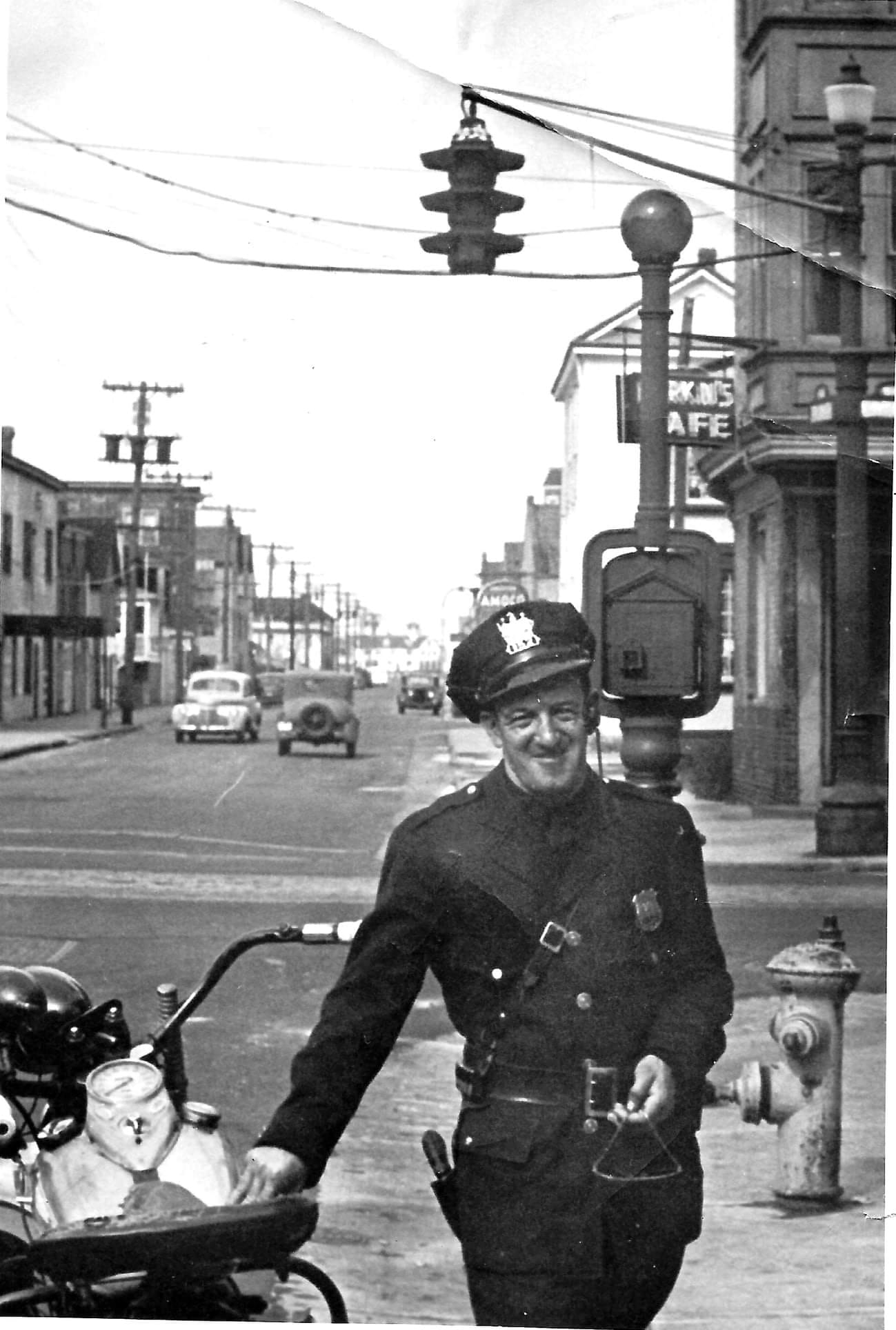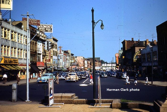 Three views of the 5-way intersection of Main, Broadway and W. Broadway in Paterson in the mid 1940s. The low-hung mast arm on the left side of the first image appears to be for pedestrians. Also interesting is the hardware fastening the side-of-pole heads in pairs with one clamp around the pole. These are Horni sectional signals.