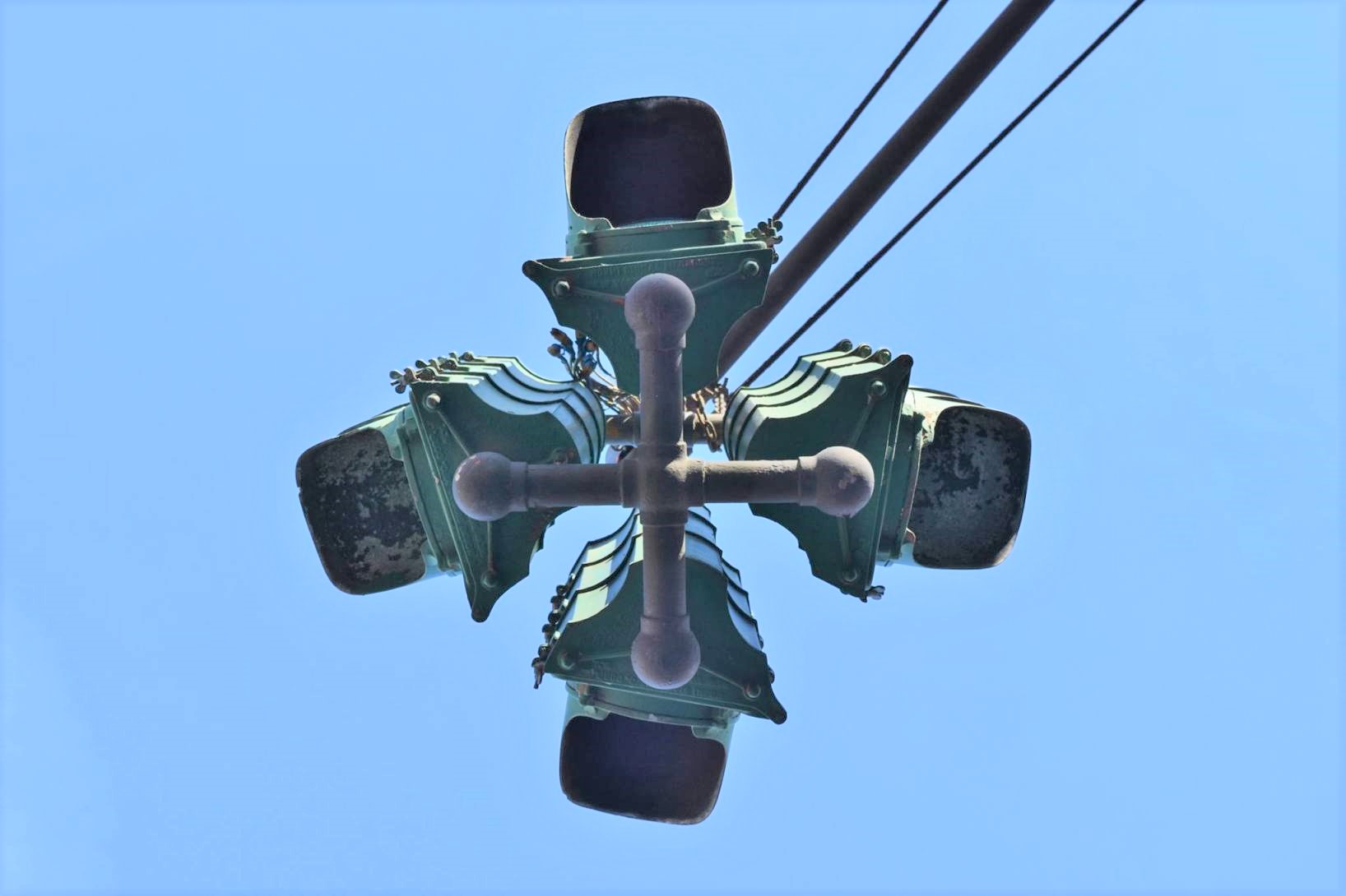 And moving a bit further south, we arrive in Hoboken, where we find a traffic light that is almost legendary among vintage signal fans – this 1930s vintage 4-way cluster signal in Hoboken, made by Horni Signal Mfg. Corp.