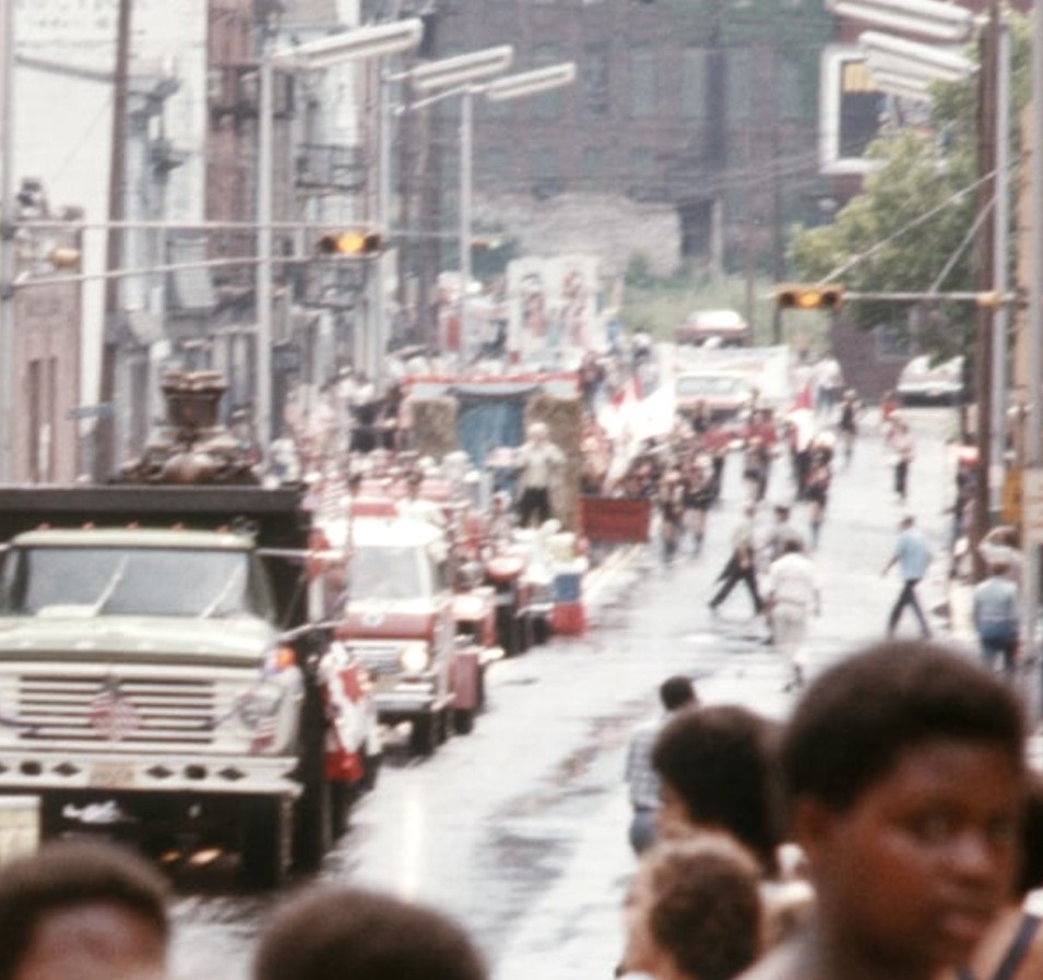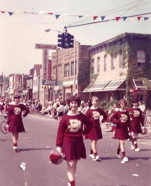 Bayonne – On the left, a corner-hinge 4-way Horni signal directs traffic by Judicke’s Bakery and Donut Shop. On the right, BHS cheerleaders parade underneath a sectional 4-way Horni/Marbelite in 1961.