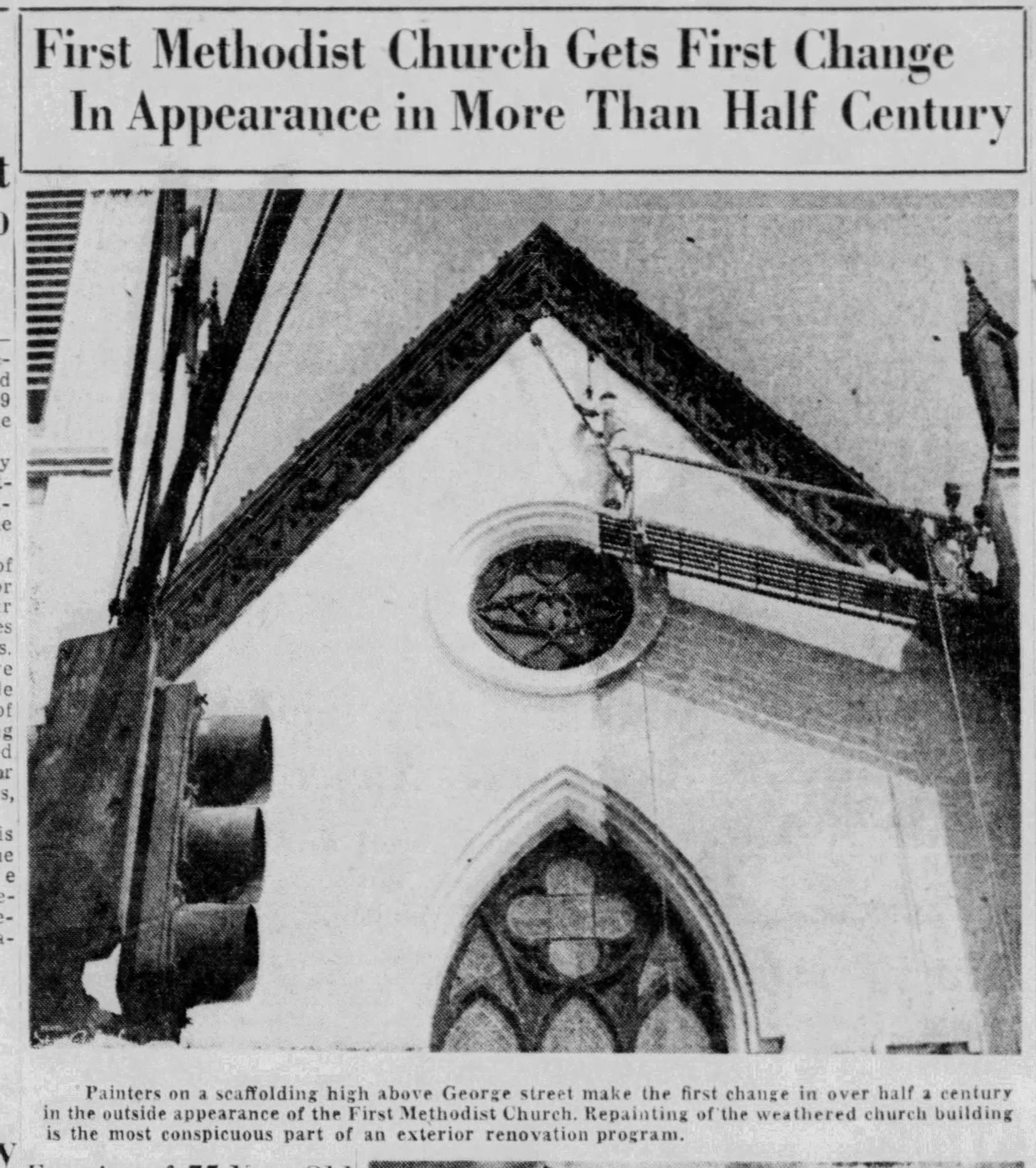 The corner of George and Livingston Streets, at Monument Square, was controlled by a very old (pre-1930) Crouse-Hinds porthole style set of signals that were hung from steel mast arms. Two 3-way clusters were originally set up, but one of those was converted to a 2-way cluster by blanking out the signal head facing Livingston Street. A signal head set up on a pedestal provided a second signal facing Livingston. The black and white newspaper closeup photo on the right shows that the blank-out configuration was done sometime before 1952.