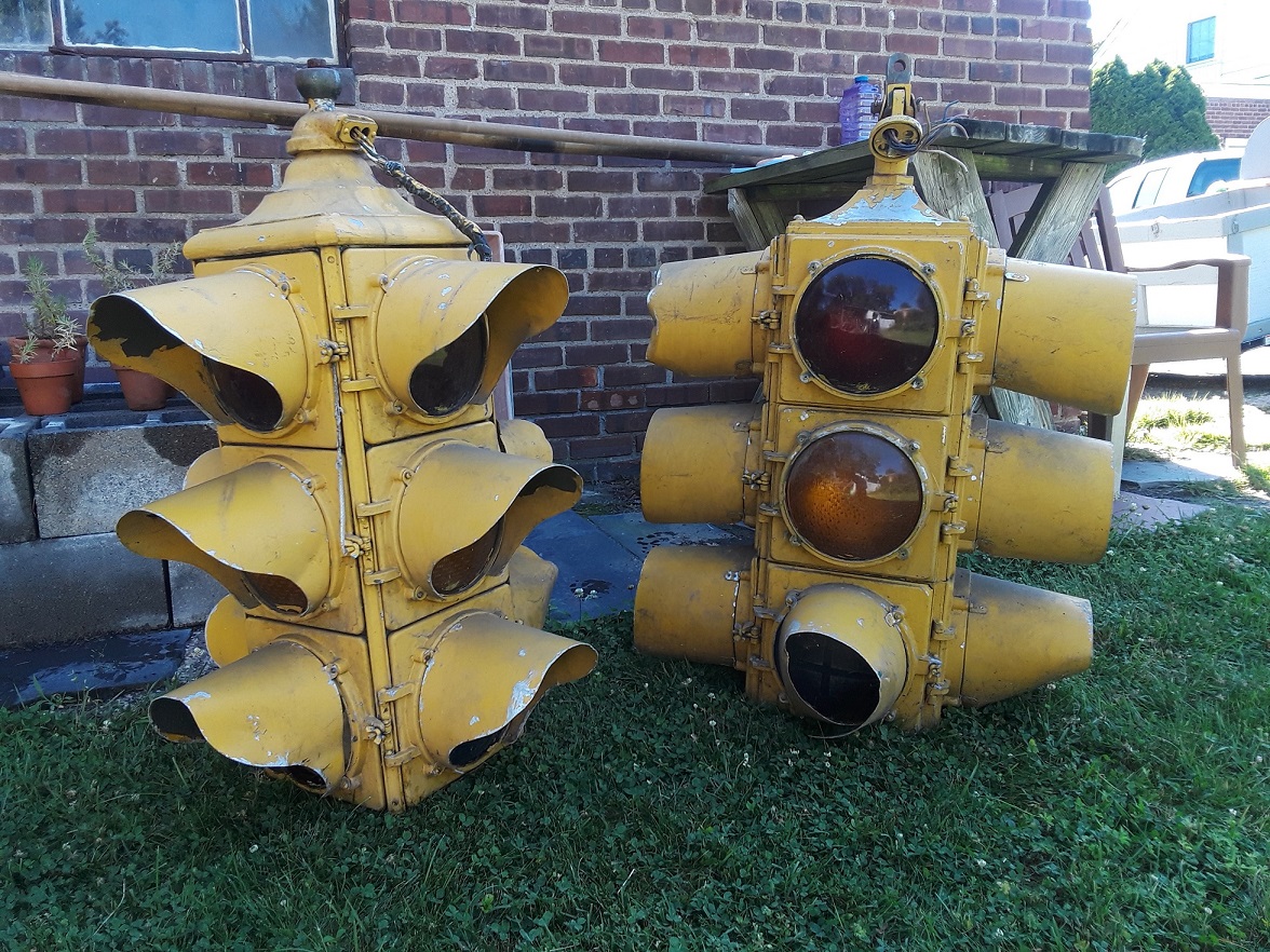 The two 4-way signals above, a GE (left) and a Marbelite, are not mine, but they have a special place in my heart, you could say. These signals served at the corner of Mill & Grand Streets in Paterson from the late 1940s until about 1974, when a car knocked the Marbelite down. The contractor who salvaged them kept them in storage for about 45 years, until 2019, when he put them on Craigslist. When I saw them, I was immediately taken back to my early childhood – and I was able to refresh the contractor’s memory as to the precise corner they came from.