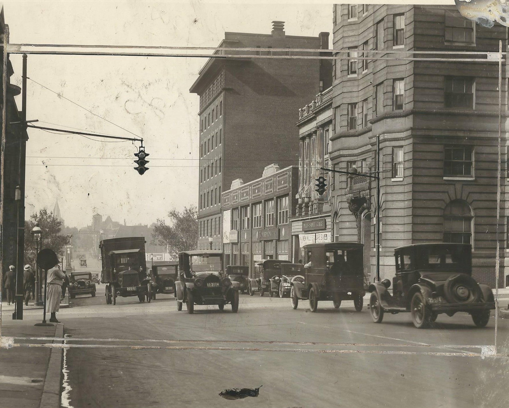 Horni Type 250 signals with 6″ lenses are suspended by steel guy-wired masts at an unknown location in the 1920s. Notice the signals heads are touched up. The signage on the buildings are for Marmon Cars and Mills Sainte Claire, small auto manufacturers from Indianapolis and Marysville, MI, respectively.