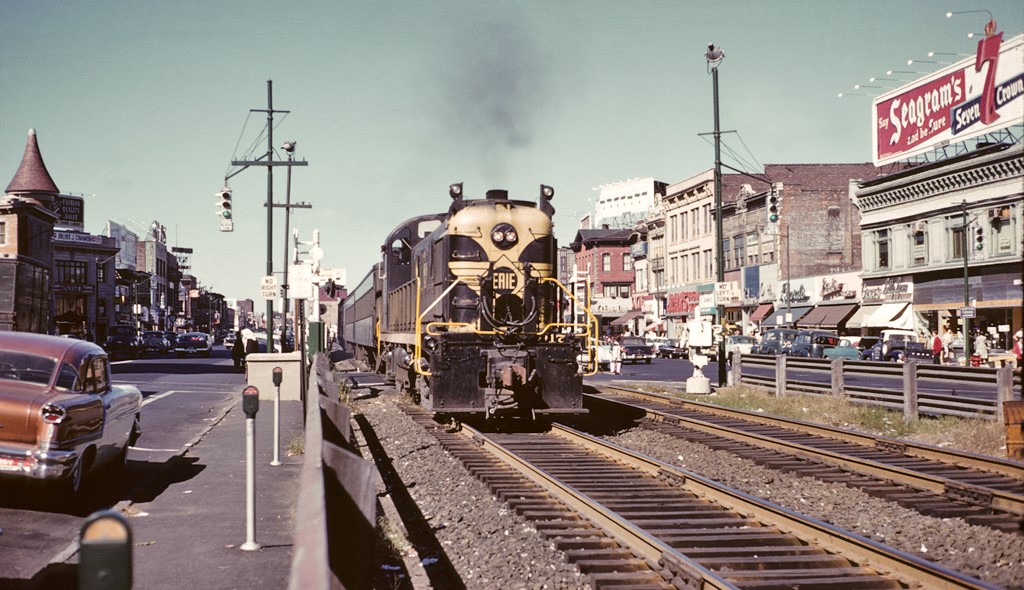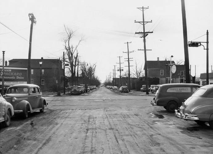 This 1949 image is of an intersection in Trenton that I wish I had more photos of. There are square louvered attachments on some of the signals to hide the indications from opposing lanes coming in a acute angles. An AGA cluster in the background looks like it has a louvered red indication facing the camera – notice the vertical striping when viewing the photo at full size. The signal cluster in the extreme upper left corner is made of sectional Horni signals. Note the decorative seashell covers on the pole base.