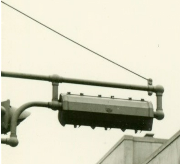 Downtown Passaic in the 1950s. These masts could be from the late ’20s. They were replaced in the early ’70s. Best I can tell, these appear to be Crouse-Hinds type D signals, as the edges look clean (i.e., no latches/hinges) and the blank sides are simply flat faces.