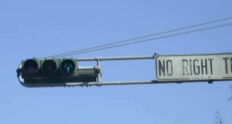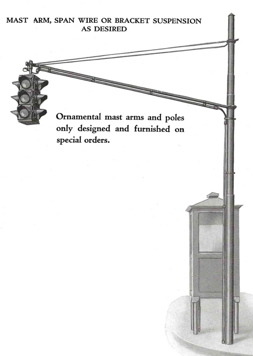 As traffic volume, road width, and average vehicle speed increased, it became increasingly common to suspend traffic signals above the road for better visibility. Steel mast arms stabilized by guy wires were installed at intersections all over New Jersey from the 1920s through World War II, after which, aluminum masts became the standard. Signal heads could be suspended on the mast either vertically or horizontally, with the red light on the left in the latter case. A small number of steel guy wire masts are still scattered around the state today, and almost none of them still have the original signals attached to them.