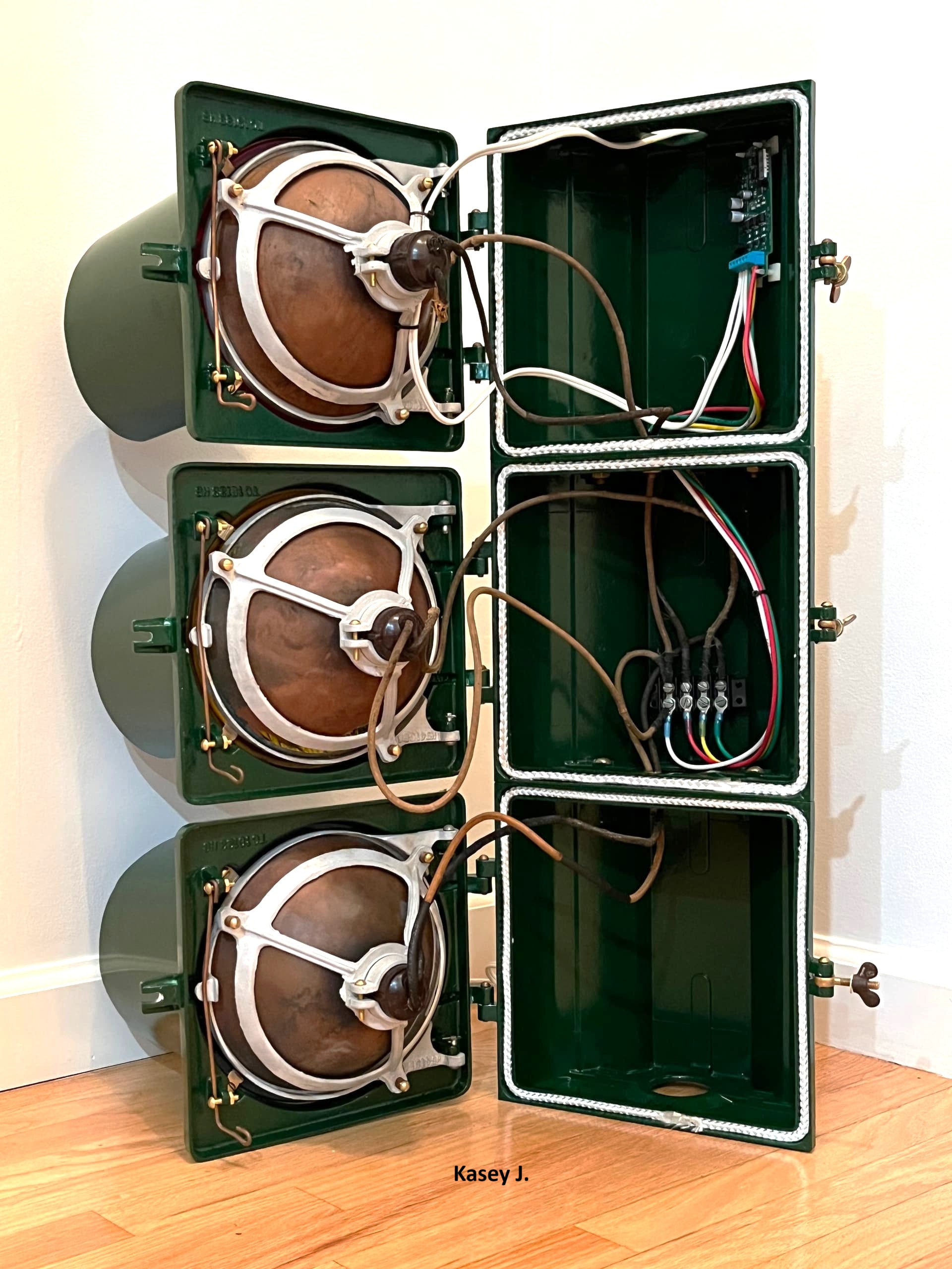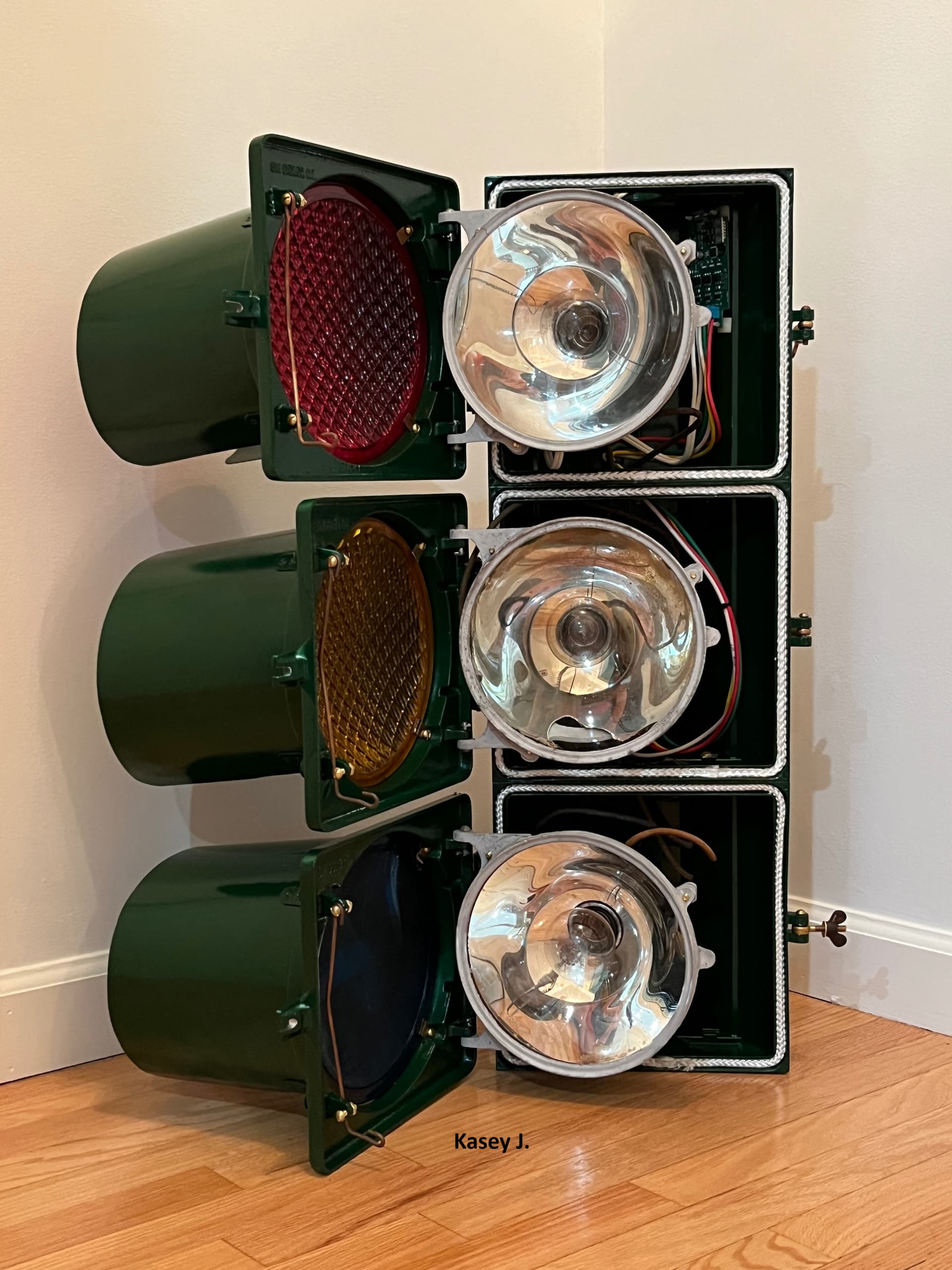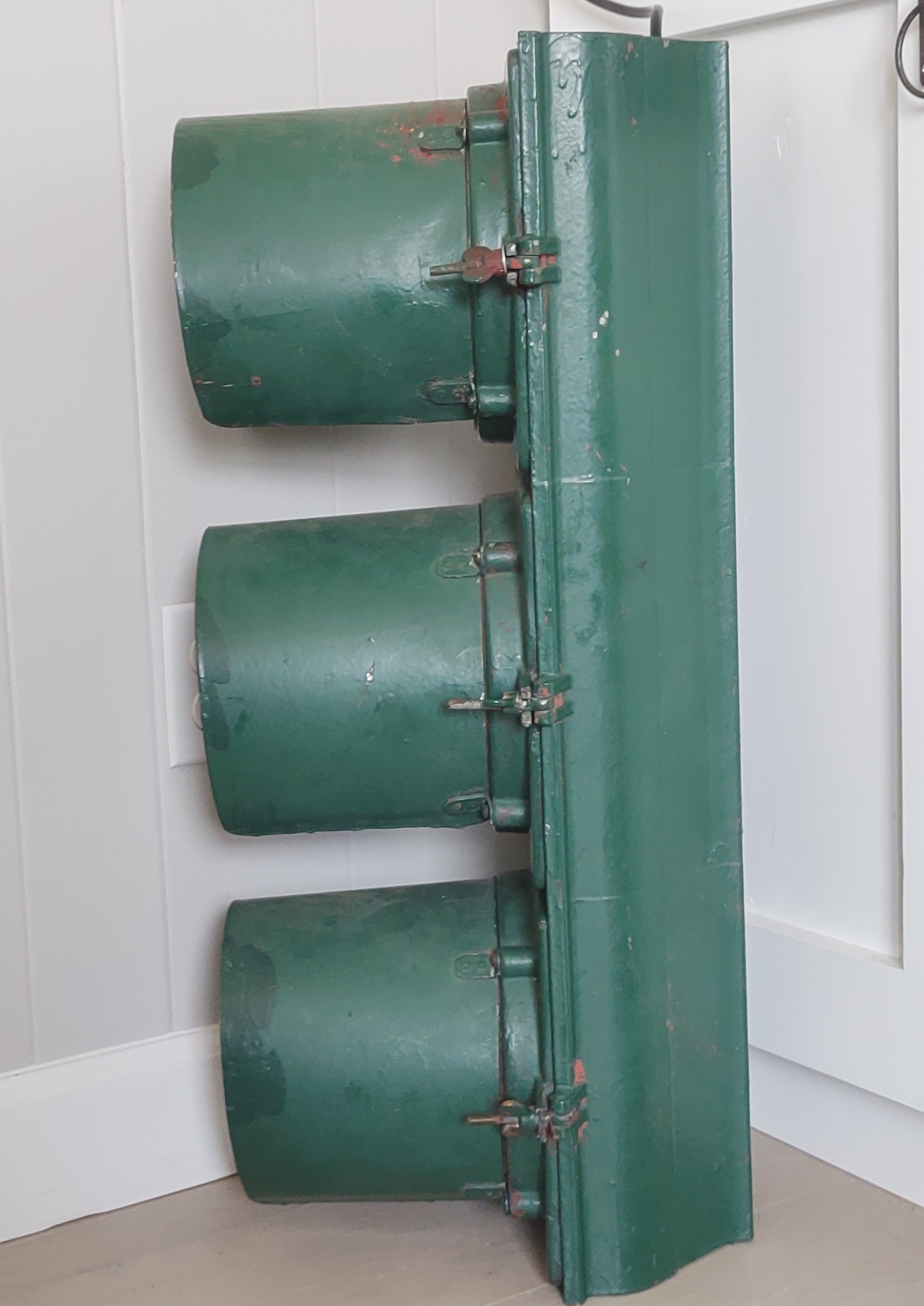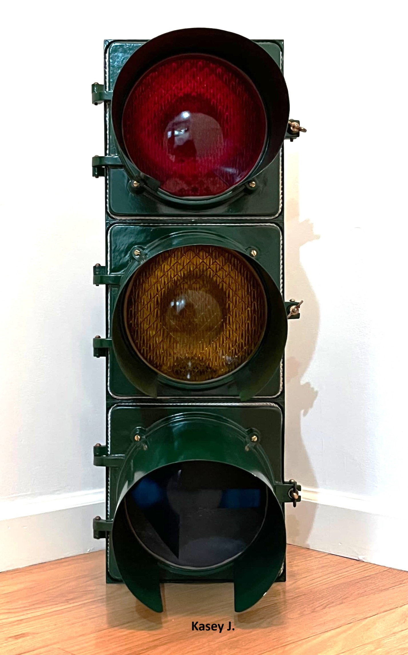 The shiny dark green signal above is the Horni that NJ collector Kasey J. found in an antique store in Hawthorne and painstakingly restored at home. It was sold without visors or lenses, and with a worn yellow finish that was almost certainly re-paint. I supplied Kasey with the 7″ visors from a damaged Marbelite signal that I had. He installed period-correct Kopp #27 red and amber lenses and a green broad arrow. We don’t know it’s history, but I have a hunch it served in the city of Paterson, next to Hawthorne where Kasey bought it.