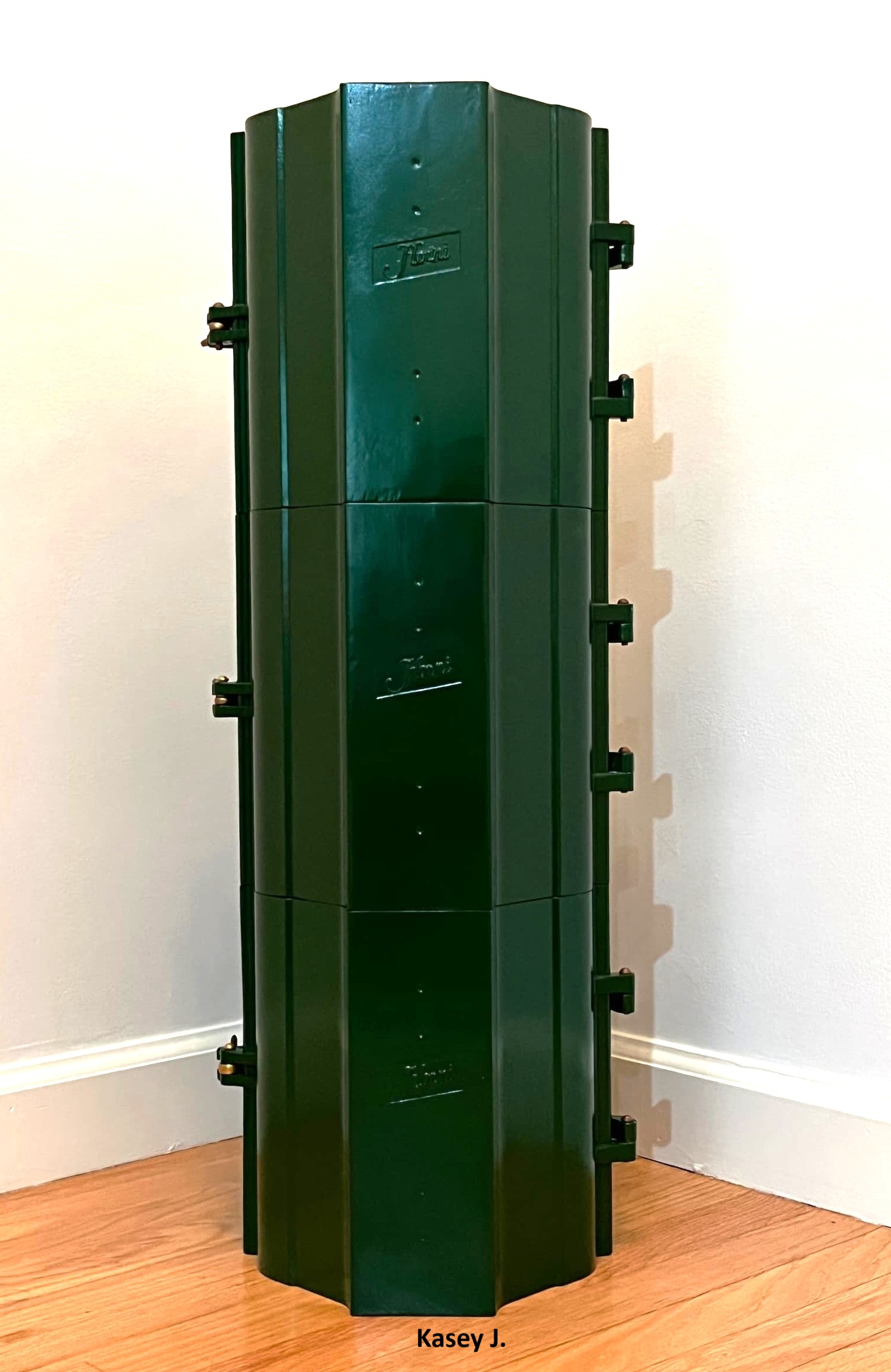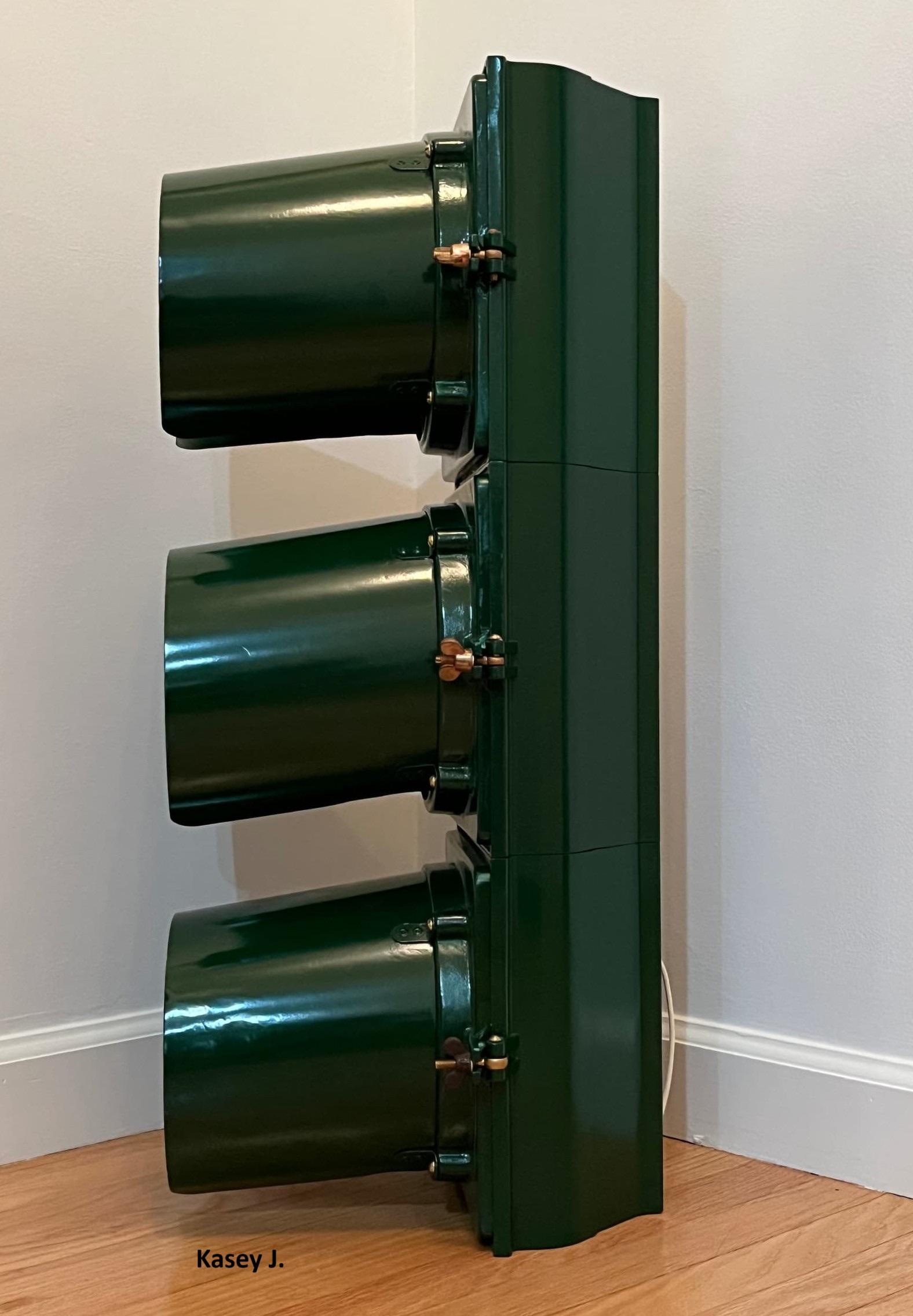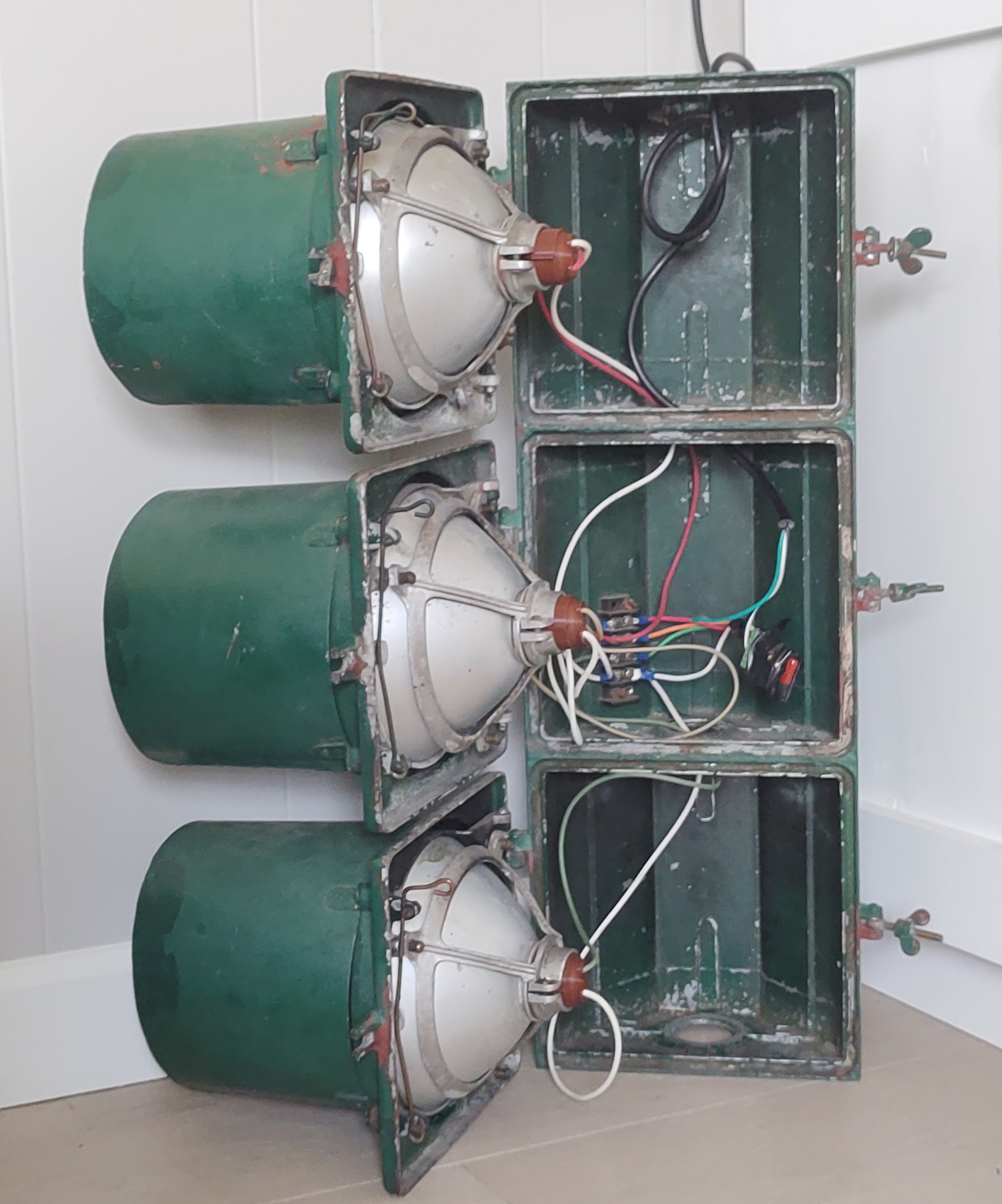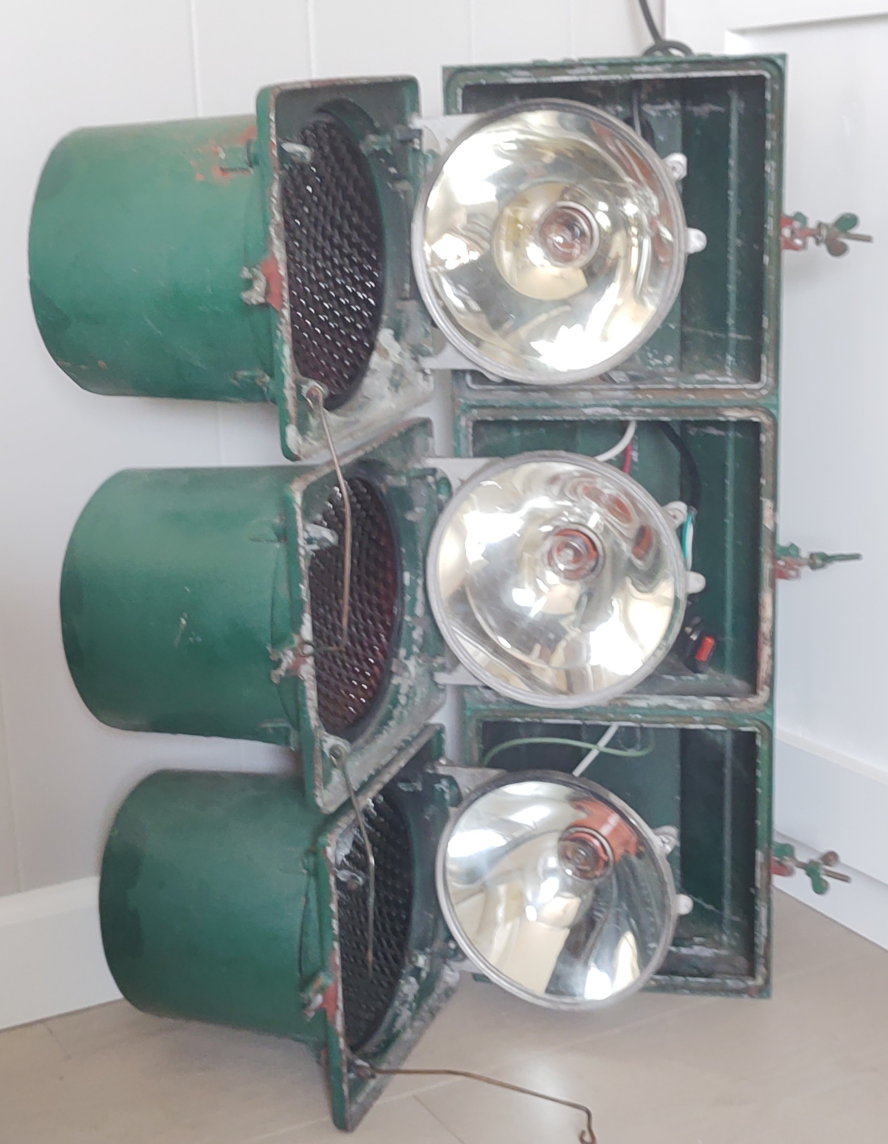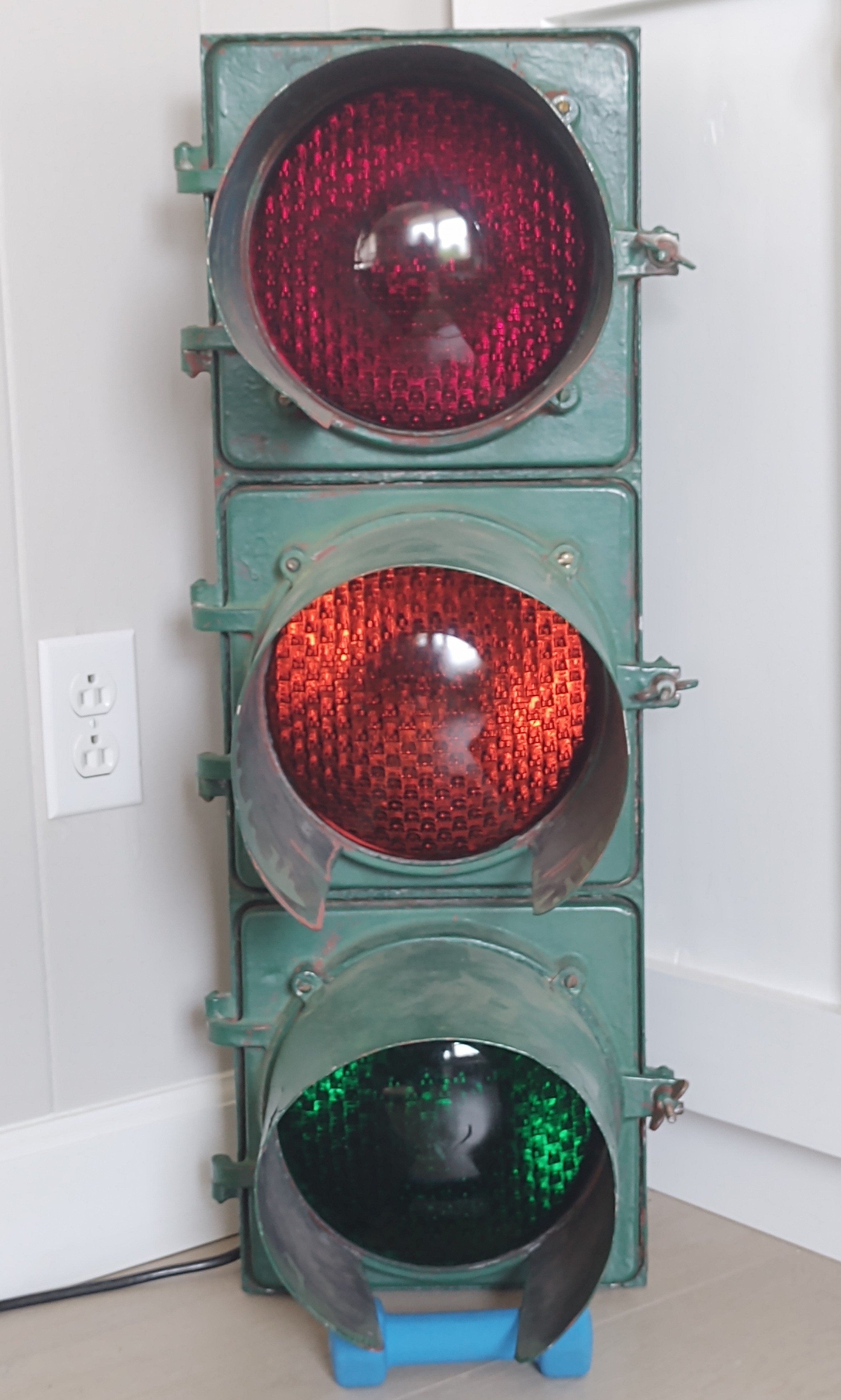 The shiny dark green signal above is the Horni that NJ collector Kasey J. found in an antique store in Hawthorne and painstakingly restored at home. It was sold without visors or lenses, and with a worn yellow finish that was almost certainly re-paint. I supplied Kasey with the 7″ visors from a damaged Marbelite signal that I had. He installed period-correct Kopp #27 red and amber lenses and a green broad arrow. We don’t know it’s history, but I have a hunch it served in the city of Paterson, next to Hawthorne where Kasey bought it.
