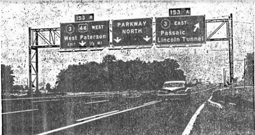 The banner image at the top of this page shows US-46 and NJ-3 shields from this time period, as depicted on exit signs on the Garden State Parkway. Photo published by the New York Times in 1964 in Autobiography of a Parkway.
