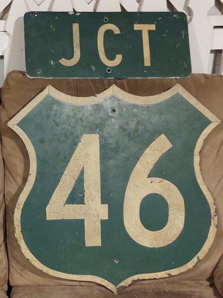 After years of keeping my eyes peeled for a 1957-62 green NJ highway marker, an opportunity to buy this US Route 46 shield with its matching Junction banner came up in early 2020. As of this writing, I have only seen two other green NJ highway markers ever offered for sale. A shout-out goes to Jake Bear for working out an agreeable trade/purchase deal with me.