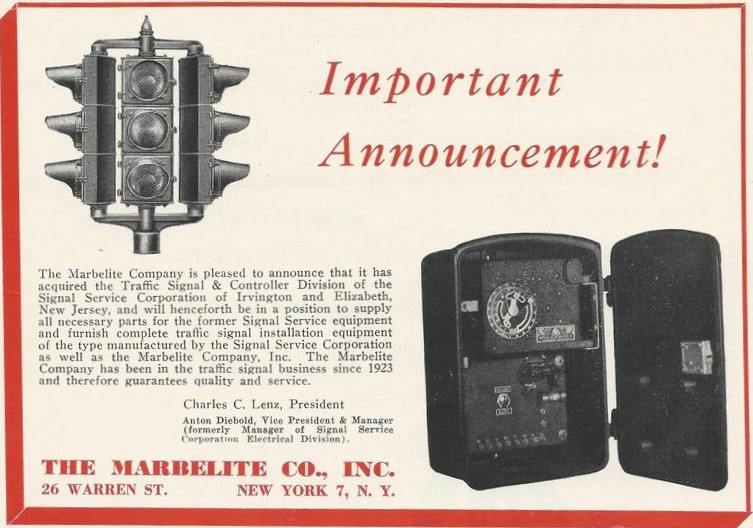The acquisition of the Signal Service Corporation’s Signal Division and patents now permits the Marbelite Company, Inc., to supply all necessary parts tor the Signal Service traffic control signals including the variable speed timing mechanisms as well as complete traffic signal equipment of the type manufactured by both organizations.