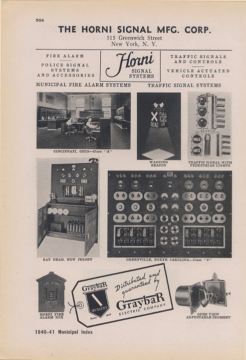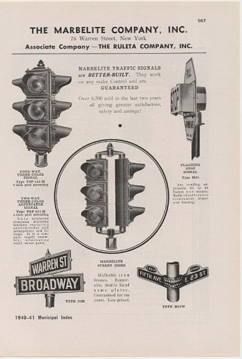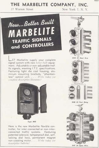 In 1947, when Horni Signal went belly-up, Marbelite acquired Horni’s more modernized equipment as their main product line, and ostensibly took over Horni’s surviving accounts, thereby becoming one of the biggest brands in traffic equipment; on the level of big competitors such as Crouse-Hinds, Eagle and GE.