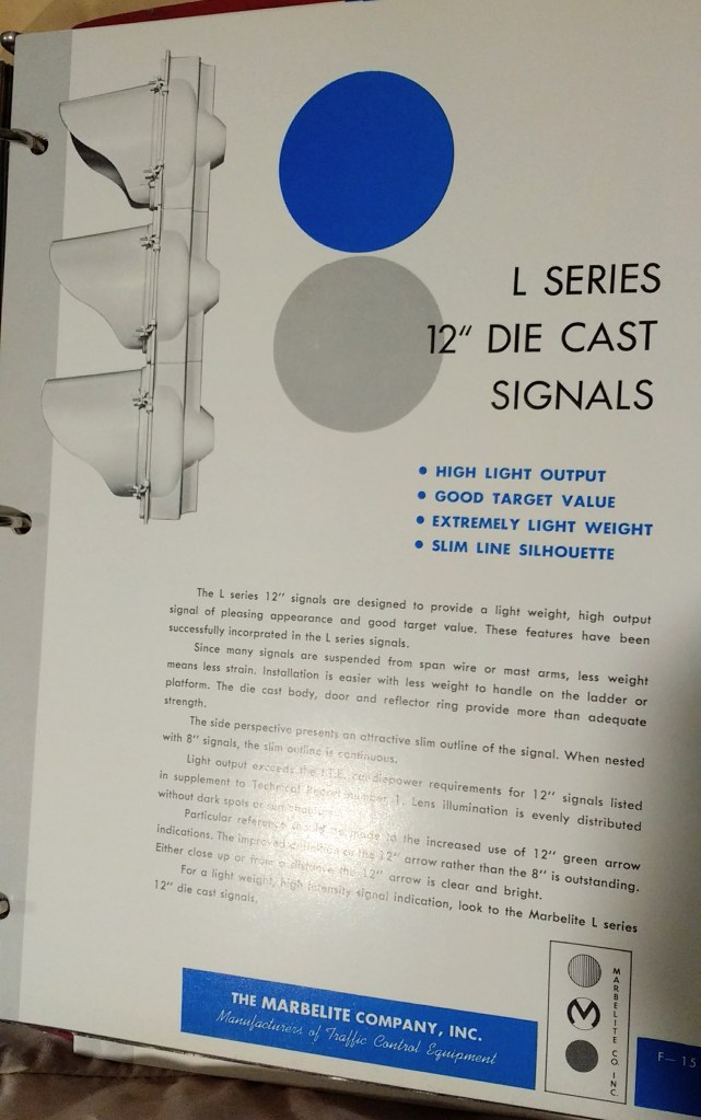 The early 1950s saw the introduction of 12″ diameter lens signals in all the major manufacturers’ catalogs. Marbelite called their 12″ signals the L Series.