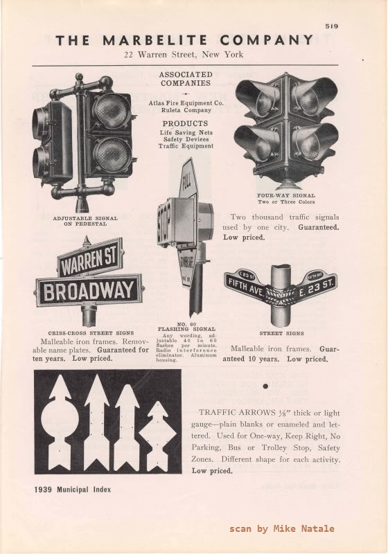 The 1939 ad only depicts two-lamp Ruleta signals, which were installed in New York City. These signals were cast from the corner-hinged molds originally made by Horni Signal, which was still doing business at the time, using newer signal designs. The new designs Horni was using in 1939 would later be acquired by Marbelite after Horni went out of business. (See the Flat-Top section below.)