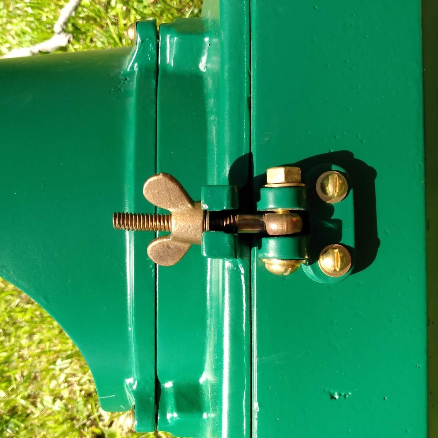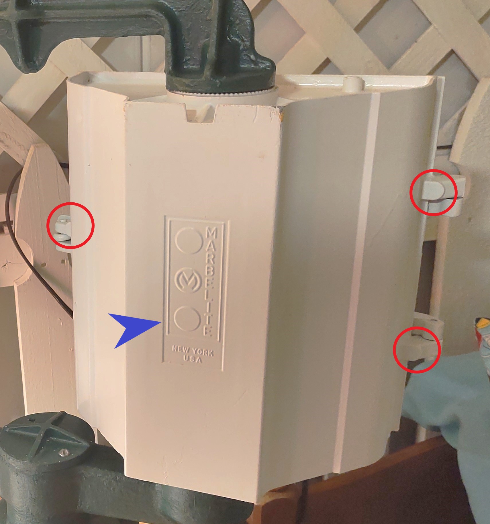The Gen 3 sectional Marbelite adjustable signals could optionally be provided with decorative end plates and tie rods. This was offered for compliance with outdated specs in certain municipalities, like Chicago and Baltimore. The end plates were merely attached to the top and bottom sections with a single bolt, and then run through with two tie rods. While not a functional necessity, the fins add a graceful touch. The fins came in at least two varieties, a flatter fin with three vertical bars, and a more peaked fin with five bars. These have been coined Finned Marbelites and Marb-Decos by some collectors.