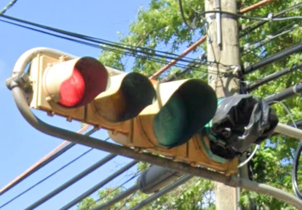 The 12″ signal sections seen above from the corner of Union and Paine Avenues in Irvington, were spotted in December 2022 by the sharp eye of Kasey J., a member of the Highway Divides forum. Nobody in the forum had ever spotted these curve-backed 12″ signals before, but the consensus was (and I agree) that these are probably the earliest and scarcest variation of the Marbelite L Series signal.