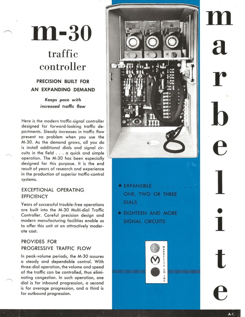 Marbelite began producing solid state analog timers in the 1960’s. One model was the MT2SRX where you could set the timing with dials rather than the pins and the cams on the M-30. Digital timers were introduced in the early 1970’s to handle complex 8 phase intersections, and interconnectivity with computers, and microprocessor timers by the mid-70’s. One of the challenges with the digital timers was the solid state relays that switched the signals operating on 120v AC from the timers that ran on low voltage DC. The early solid state relays often failed from excessive heat. Technology later opened the door for a number of high tech companies to enter the field.