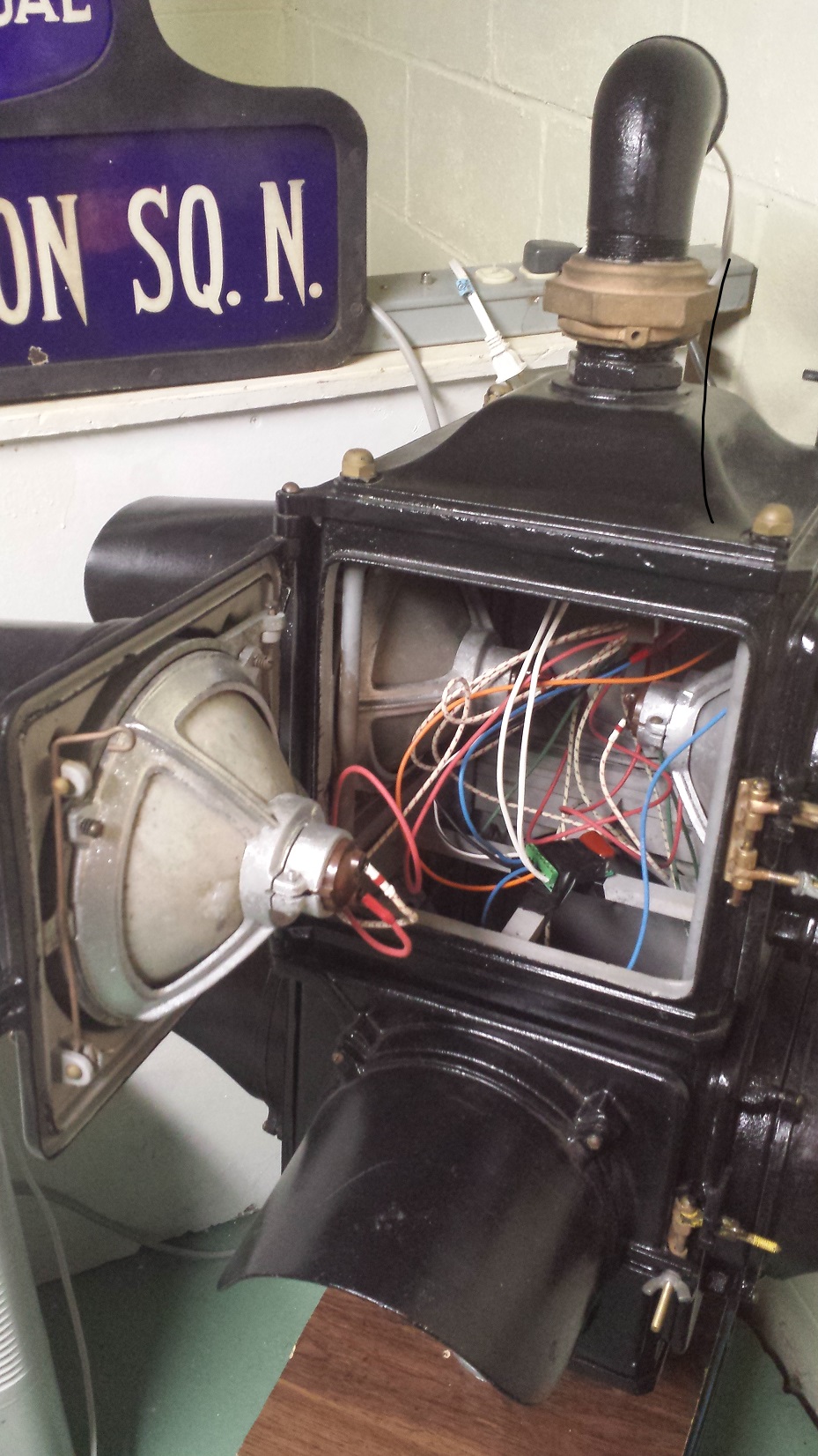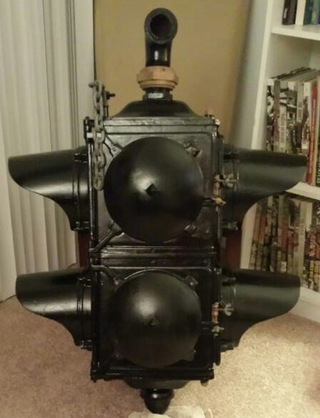 In early 2014, I had the light professionally stripped before I brushed-painted it glossy black. New York City originally painted their signals either black or olive green. All of them were re-painted yellow in the 1960s during the reign of Traffic Commissioner Henry Barnes. I was able to extract a couple snapped bolts, but several remain. The light was was missing one of the brass pin mounts and six out of the eight “Mickey Mouse ears” wing nuts. I was able to find all of those parts through other collectors, and it took me until 2024 to replace the last wing nut, which I found on an old loom we threw away from the attic.