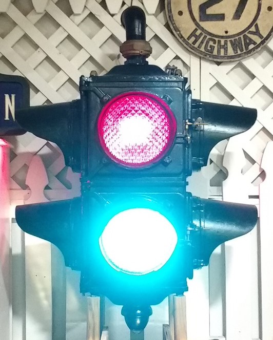 In May 2012, I spotted a cryptic, text-only Craigslist ad for a traffic light. I had a hunch that it might be a desirable light, so I wrote to the seller, and received one small image (above, left) that confirmed my hunch. At that time, Ruletas were not showing up very often, and the prices had gotten quite high. The seller was asking a fair price price for this one, so I immediately drove up to New Hampshire to make the purchase. The seller, a New York retiree, told me that the light was given to him on the spot by the contractor who was removing it from service on Merrick Boulevard in Laurelton in the mid ’70s. Looking through old photos, I am not certain that Merrick Boulevard had any overhead 2-color lights, so I wonder if his memory may be wrong about the precise location.