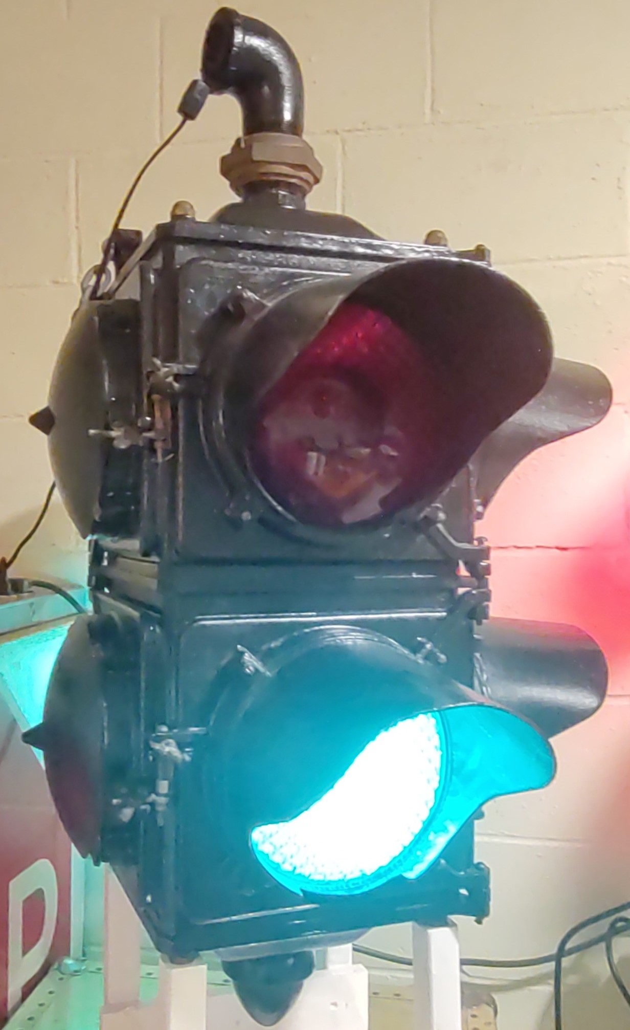 This is a later variation of this type of signal, probably made after World War II. The original wiring was plastic-coated, but the feed wires into the light were cloth insulated. There is a 2″ steel elbow at the top for mount on an overhead mast. It is configured as a 3-way signal, with one of the four sides covered by cast aluminum “blanks”. To my initial surprise, there were lenses, reflectors, and light bulbs under the blanks. All lenses are Kopp No. 27.