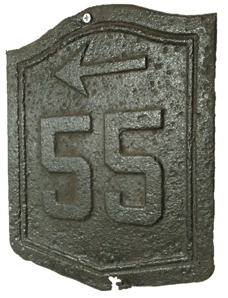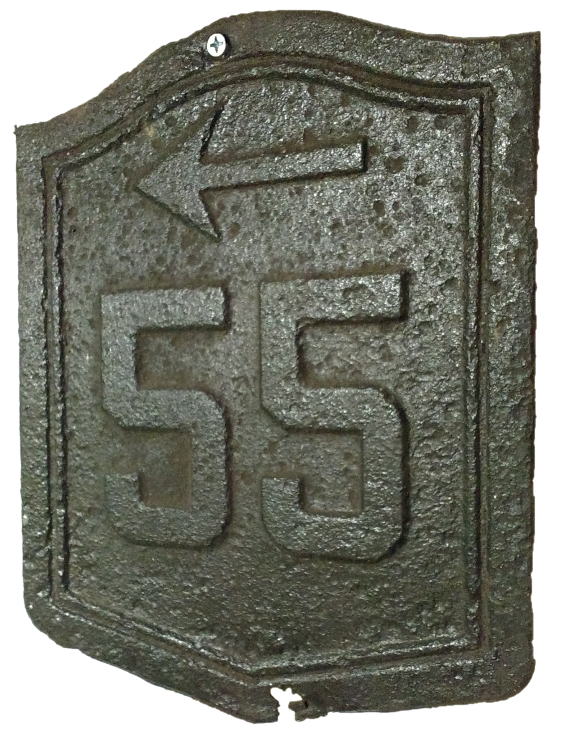 This is a very old, embossed 13″ x 10″ shield directing traffic to the left to toward (or to stay on) NY Route 55.