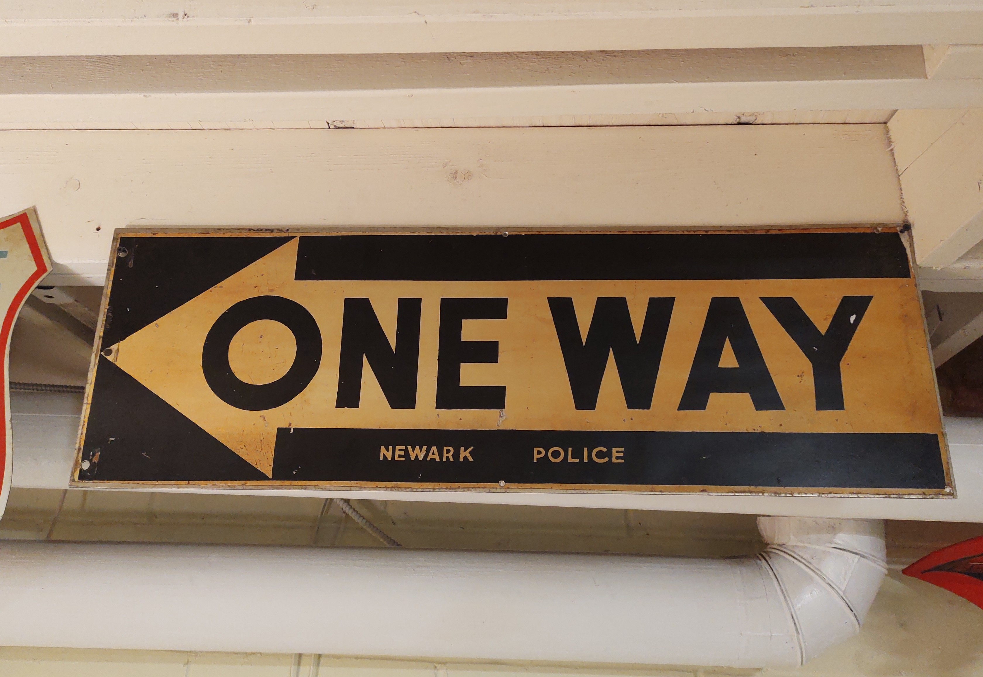 Purchased from the awesome collection of Ed Tapanes, this 1950s-60s ONE WAY sign with its unique design and label by the Newark Police is a gem. It is two-sided and measures 36″ x 12″.