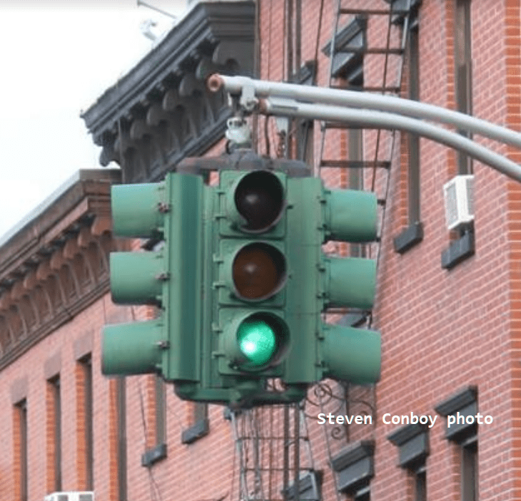 When the City of Hoboken upgraded the signals along Washington Street in 2018, two of the oldest signals still operating in New Jersey were finally retired. The older of the two lights, a 1930s Horni Signal from 1st Street, was installed in the Hoboken Historical Museum by Chris McNally, Randy Trezak, Mike Natale and myself in October of that year. The museum staff were delighted to have the city’s oldest surviving signal added to their museum’s display, so they graciously gave us this, the city’s second oldest surviving signal. I have one of the four heads from this classic light in my collection (and for a little while, I had two of them). It’s one of those lights I could tell was really old, so I was very happy to have the chance to inspect it, and happier still to own it.