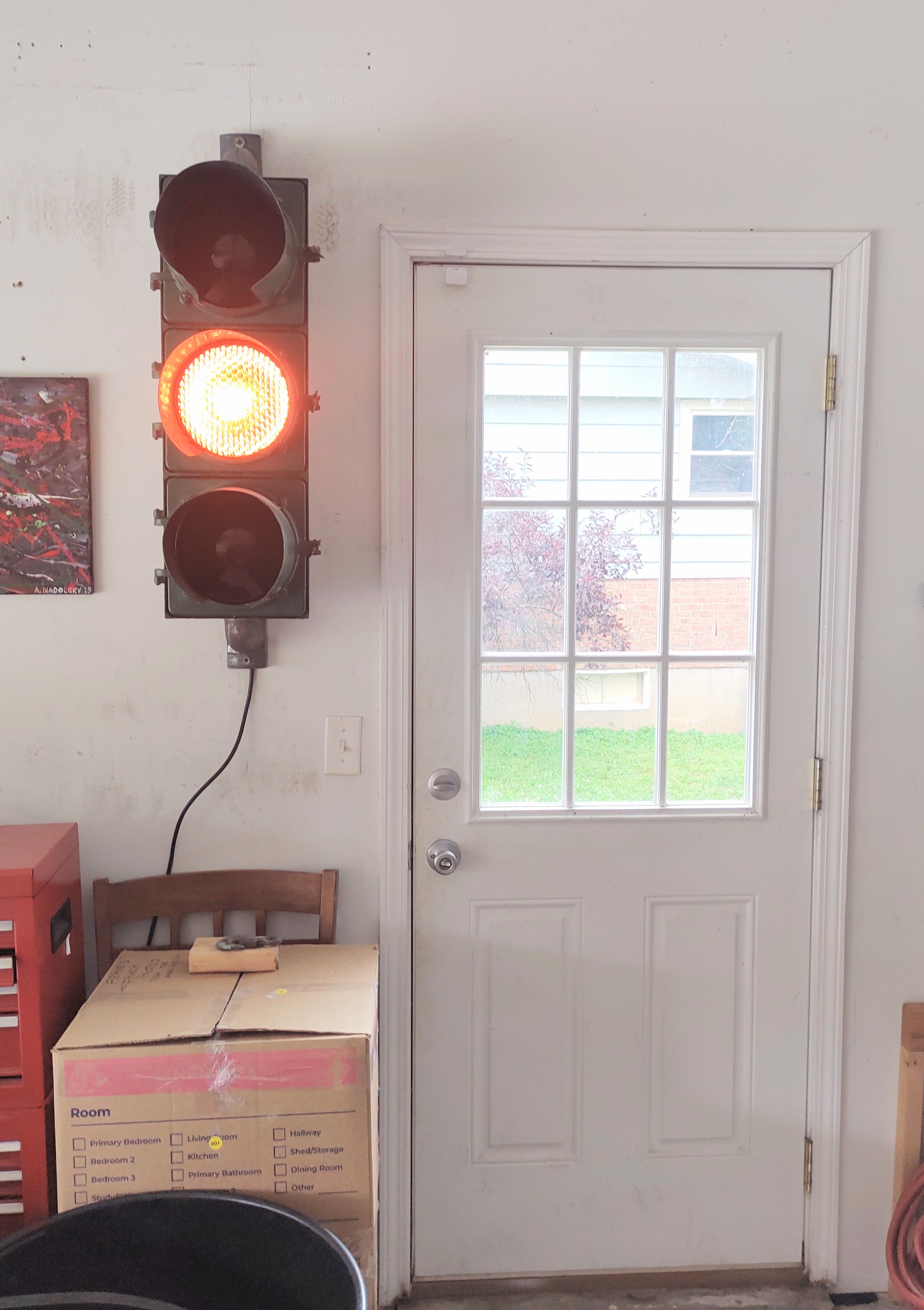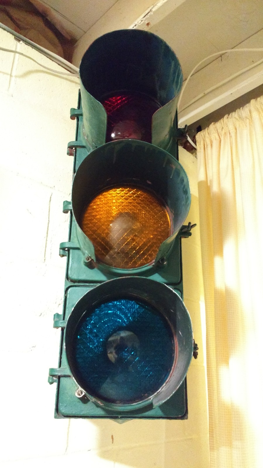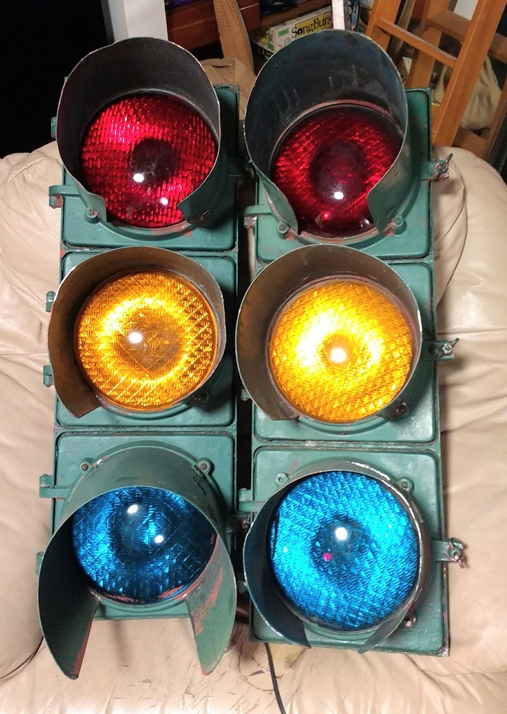 The purist in me always thinks twice about swapping out the original parts from an old signal, but when I found a scarce set of Marbelite No. 6540 lenses made by Houzex (Houze-Convex) Glass, it was a no-brainer to display them in this signal. They have a neat “Space Invaders” bead pattern, and very rich color. The green lens is “true green”, not the typical cyan of most green signal lenses. The amber lenses were made to at least two very different colors specifications. I used a darker amber for this signal.