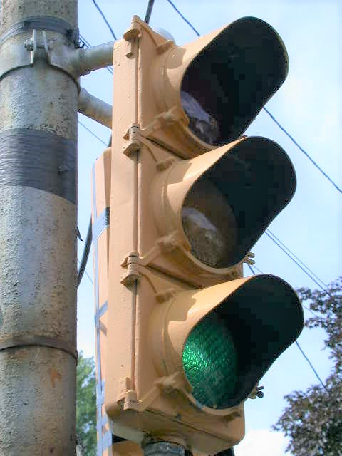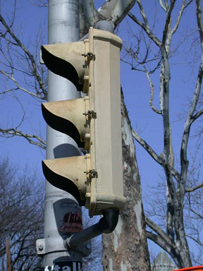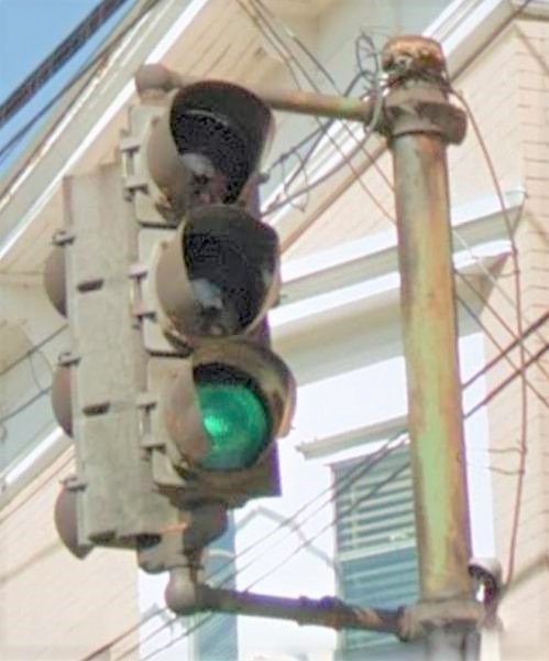 GE signals were very popular in Newark. In 2005, I spotted this 1930s GE “Wide-Hinge” Novalux still going there. The lenses were the original GE Holophane glass lenses. Sadly, his light was replaced soon after I found it. There are still many modular GE signals in Newark today, but I’m not sure if any solid-cast Novaluxes are left.