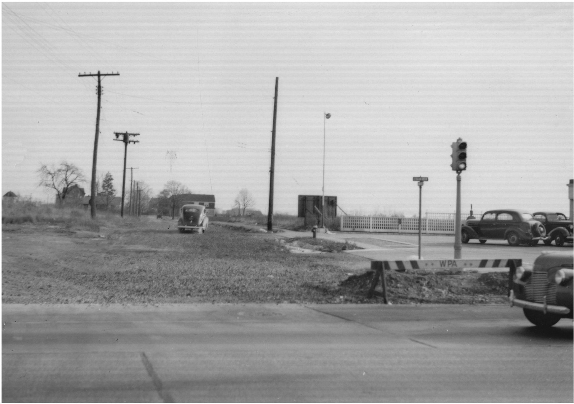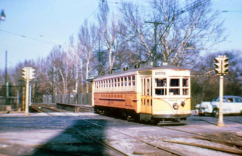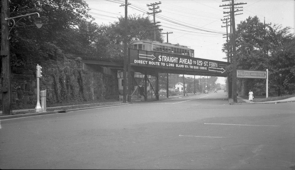 Left: This view is from Gorge Road in Cliffside Park, with a Public Service trolley on the overpass. The corner-hinged Horni signal and controller boxes appear to be brand new, painted in shiny silver.