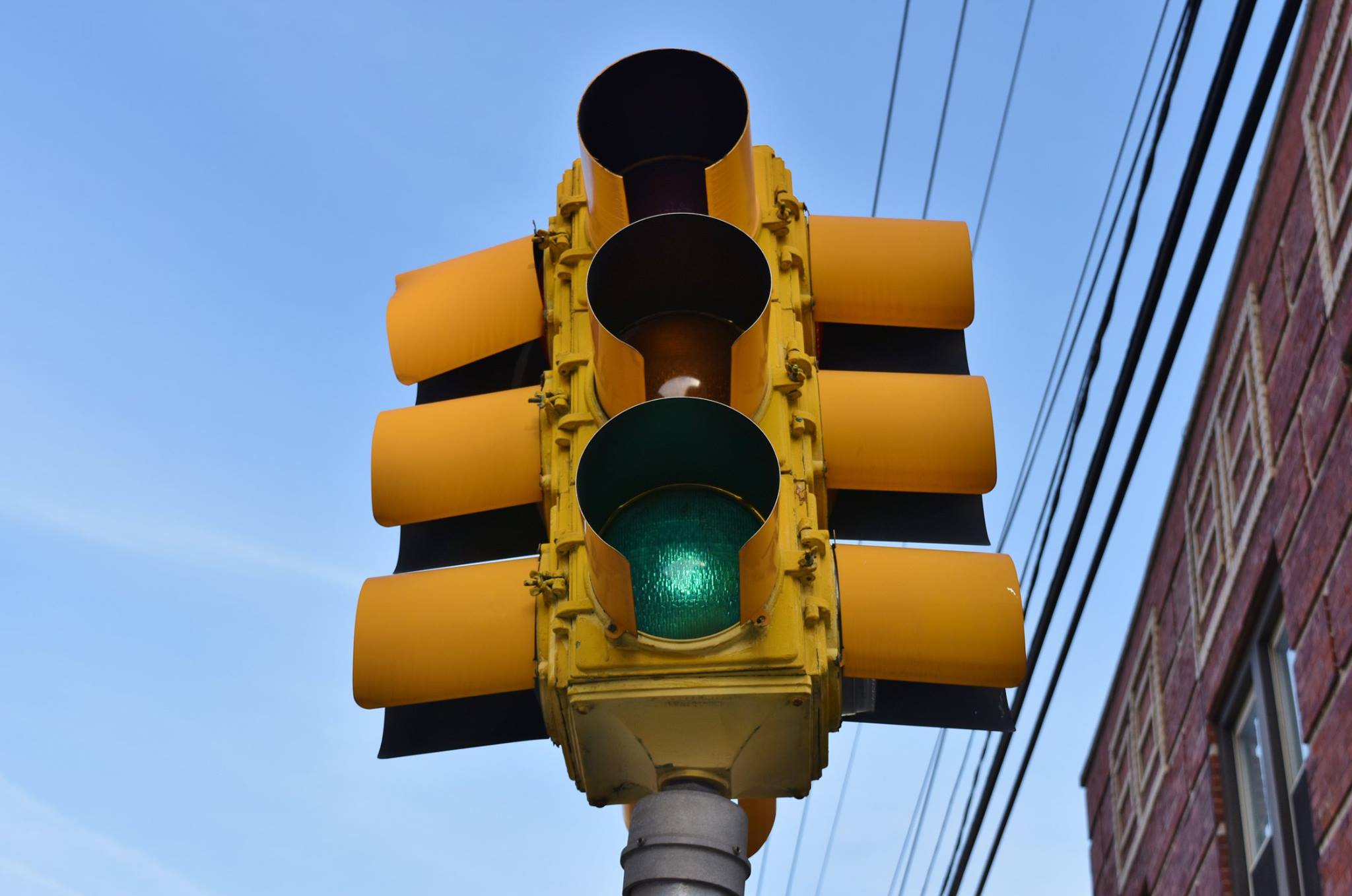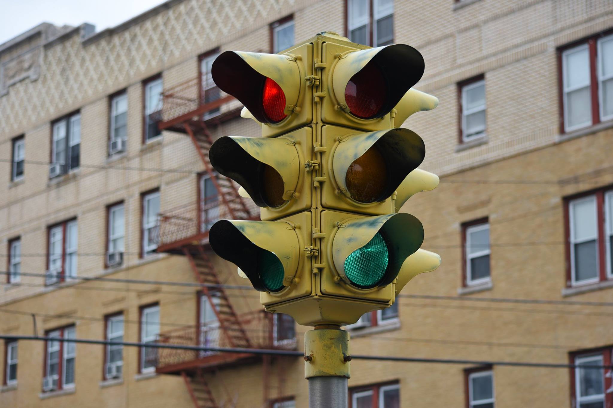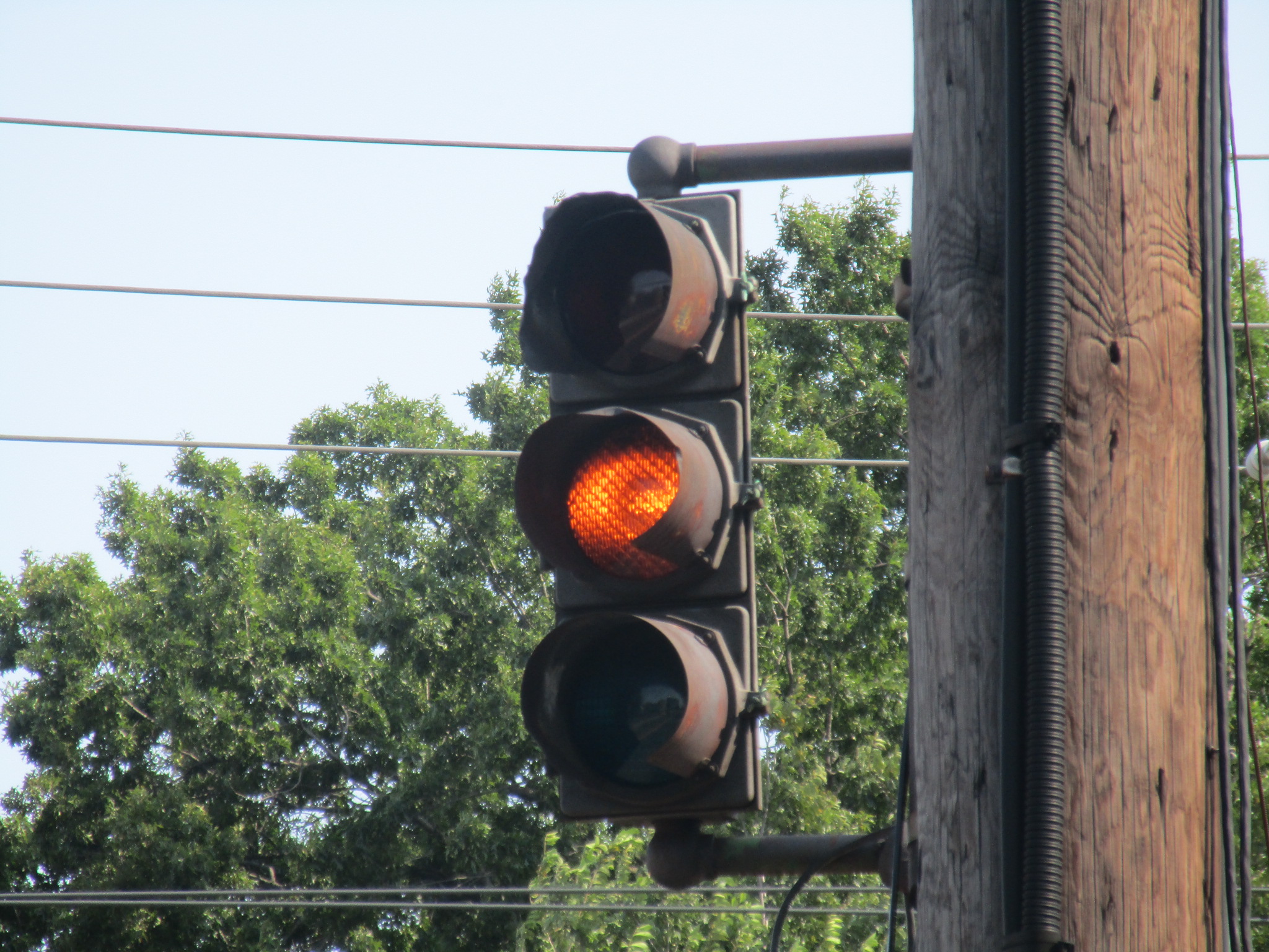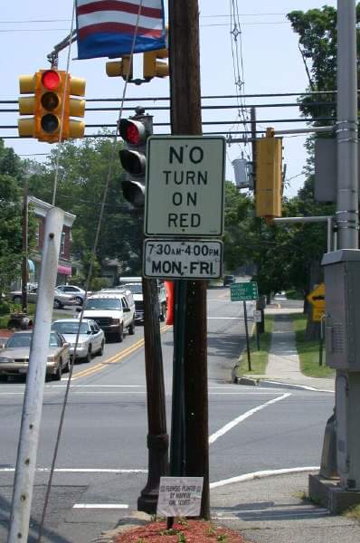 When traffic lights were first being installed around the country, it was most common for the signal heads to be mounted on top of pedestals about 8 feet tall on the corner, or on an “island” in the middle of the intersection. In lieu of installing a new pedestal, many signals were bracket-mounted to the side of existing utility and streetlamp posts. During this era, it was not uncommon to have only one light facing each approach. Pedestals and bracket-mounted signals are still used today, but they are usually auxiliary to signals hanging overhead. This page shows some New Jersey installations from the pedestal era.