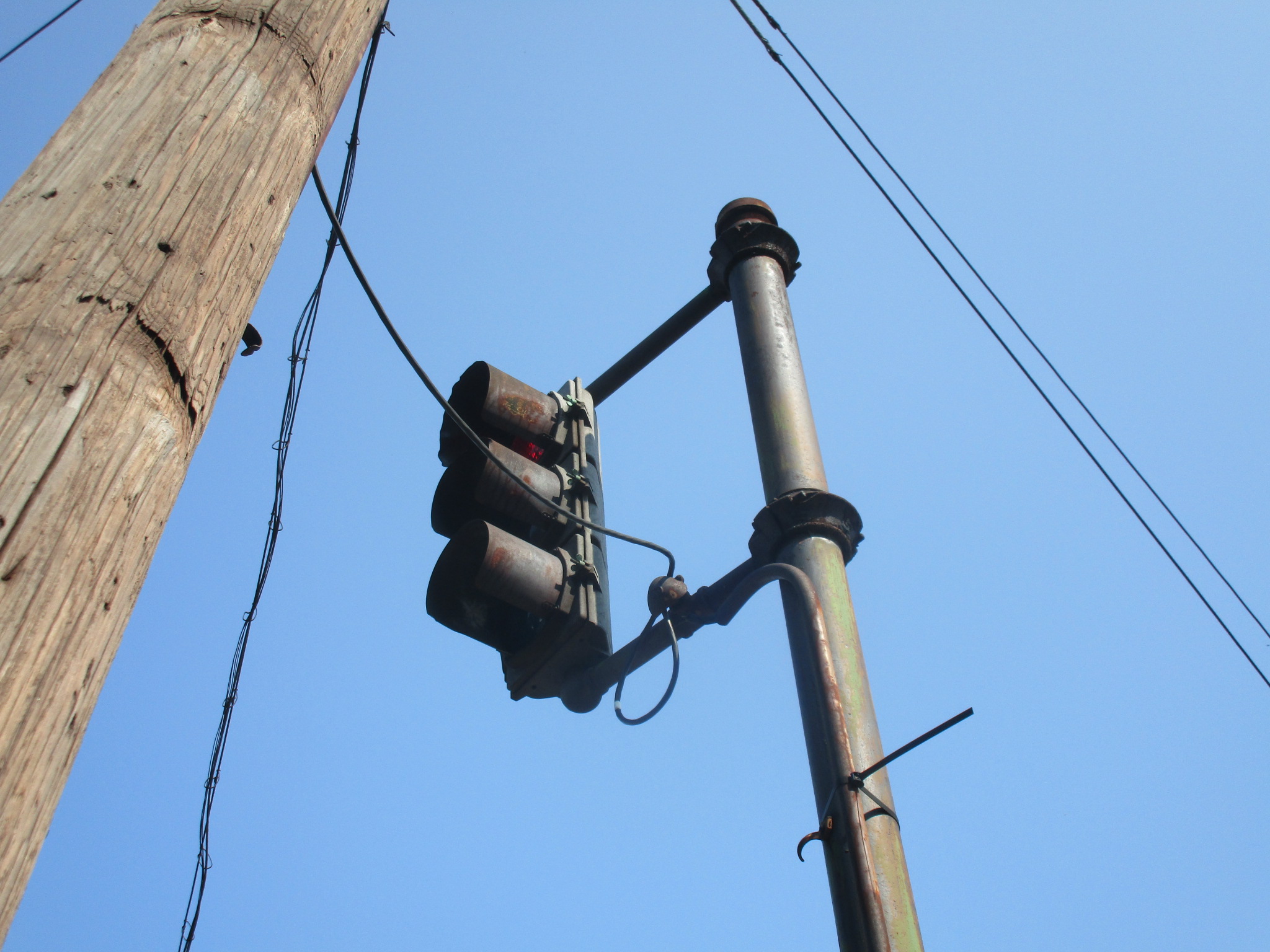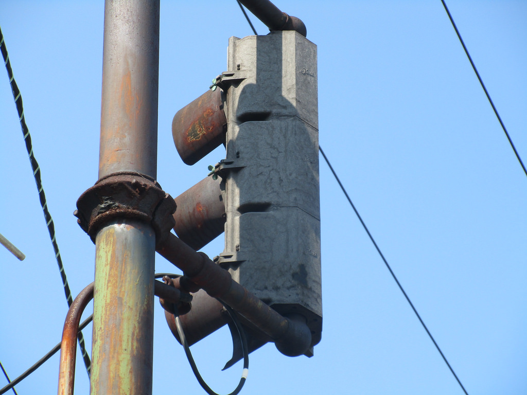 A couple years later, collector David Prince made his way to this intersection with camera in hand. Although the paired lights above were sadly gone, David spotted another Bakelite signal that Chris had missed, tucked away next to a telephone pole across the street. He took some excellent photos (below) and this video. This is probably the very last Horni brand signal head in operation in the state.